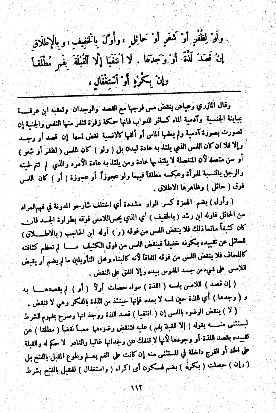 ـــــــــــــــــــــــــــــQوَقَالَ الْمَازِرِيُّ وَعِيَاضٌ يَنْقُضُ مَسُّ فَرْجِهَا مَعَ الْقَصْدِ وَالْوِجْدَانِ وَتَعَقَّبَهُ ابْنُ عَرَفَةَ بِمُبَايَنَةِ الْجِنْسِيَّةِ وَآدَمِيَّةِ الْمَاءِ كَسَائِرِ الدَّوَابِّ فَإِنَّهَا سَمَكَةٌ زُفَرَةٌ تَنْفِرُ مِنْهَا النَّفْسُ وَالْجِنِّيَّةُ إنْ تَصَوَّرَتْ بِصُورَةِ آدَمِيَّةٍ وَلَمْ يَعْلَمْهَا الْمَاسُّ أَوْ أَلِفَهَا كَالْإِنْسِيَّةِ نَقَضَ لَمْسُهَا إنْ قَصَدَ أَوْ وَجَدَ وَإِلَّا فَلَا إنْ كَانَ اللَّمْسُ الَّذِي يُلْتَذُّ بِهِ عَادَةً لِبَدَنٍ بَلْ (وَلَوْ) كَانَ اللَّمْسُ (لِظُفْرٍ أَوْ شَعْرٍ) أَوْ سِنٍّ مُتَّصِلَةٍ لِأَنَّ الْمُنْفَصِلَةَ لَا يُلْتَذُّ بِهَا عَادَةً وَمَنْ يُلْتَذُّ بِهِ عَادَةً الْأَمْرَدُ وَاَلَّذِي لَمْ تَتِمَّ لِحْيَتُهُ وَالرَّجُلُ بِالنِّسْبَةِ لِلْمَرْأَةِ وَعَكْسُهُ مُطْلَقًا فِيهِمَا وَلَوْ عَجُوزًا أَوْ عَجُوزَةً (أَوْ) كَانَ اللَّمْسُ فَوْقَ (حَائِلٍ) وَظَاهِرُهَا الْإِطْلَاقُ.