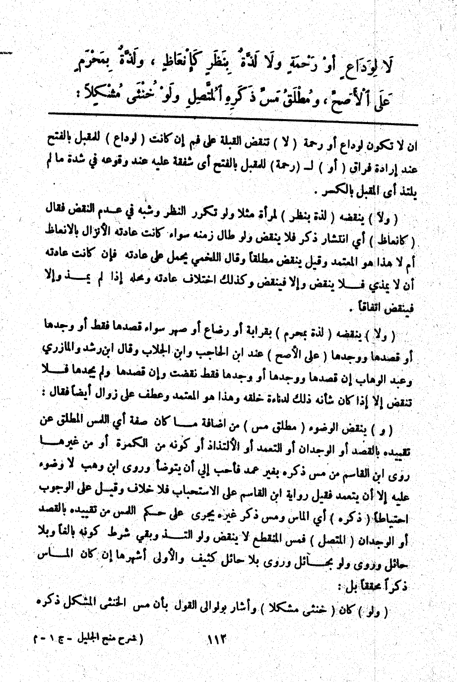ـــــــــــــــــــــــــــــQأَنْ لَا تَكُونَ لِوَدَاعٍ أَوْ رَحْمَةٍ (لَا) تَنْقُصُ الْقُبْلَةُ عَلَى فَمٍ إنْ كَانَتْ (لِوَدَاعٍ) لِلْمُقَبَّلِ بِالْفَتْحِ عِنْدَ إرَادَةِ فِرَاقٍ (أَوْ) لِ (رَحْمَةٍ) لِلْمُقَبَّلِ بِالْفَتْحِ أَيْ شَفَقَةً عَلَيْهِ عِنْدَ وُقُوعِهِ فِي شِدَّةٍ مَا لَمْ يَلْتَذَّ أَيْ الْمُقَبِّلُ بِالْكَسْرِ.