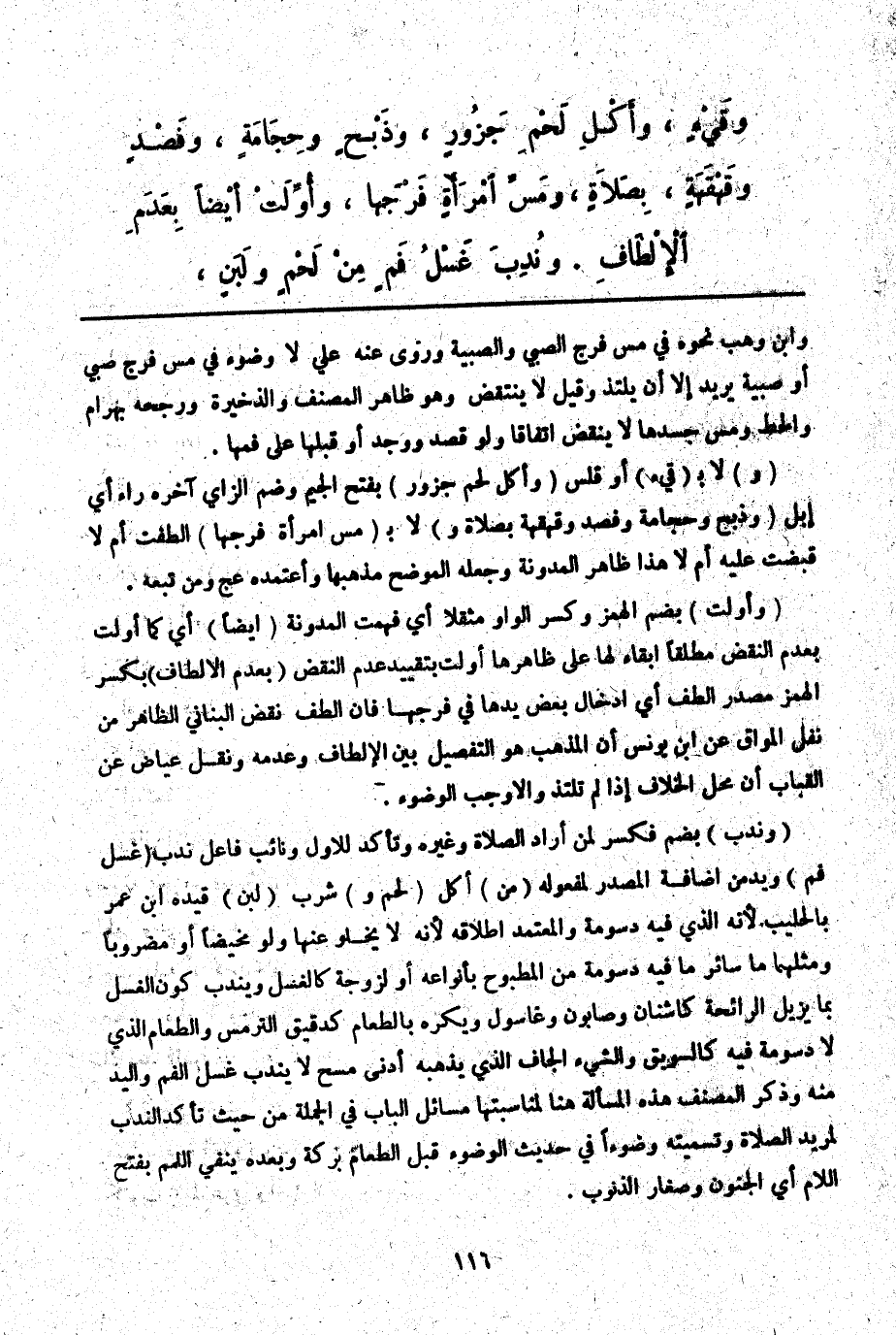 (وَ) لَا بِ (قَيْءٍ) أَوْ قَلْسٍ (وَأَكْلِ لَحْمِ جَزُورٍ) بِفَتْحِ الْجِيمِ وَضَمِّ الزَّايِ آخِرُهُ رَاءٌ أَيْ إبِلٍ (وَذَبْحٍ وَحِجَامَةٍ وَفَصْدٍ وَقَهْقَهَةٍ بِصَلَاةٍ) (وَ) لَا بِ (مَسِّ امْرَأَةٍ فَرْجَهَا) أَلْطَفَتْ أَمْ لَا قَبَضَتْ عَلَيْهِ أَمْ لَا هَذَا ظَاهِرُ الْمُدَوَّنَةِ وَجَعَلَهُ الْمُوَضِّحُ مَذْهَبًا وَاعْتَمَدَهُ عج وَمَنْ تَبِعَهُ.