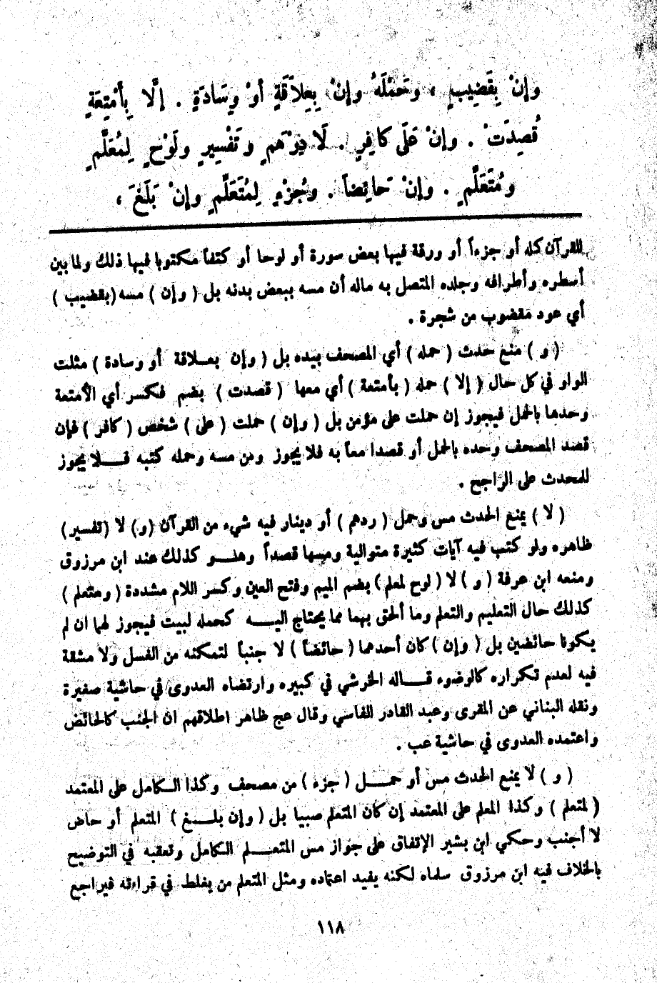 ـــــــــــــــــــــــــــــQلِلْقُرْآنِ كُلِّهِ أَوْ جُزْءًا أَوْ وَرَقَةً فِيهَا بَعْضُ سُورَةٍ أَوْ لَوْحًا أَوْ كَتِفًا مَكْتُوبًا فِيهَا ذَلِكَ وَلِمَا بَيُنَ أَسْطُرَهُ وَأَطْرَافَهُ وَجِلْدَهُ الْمُتَّصِلَ بِهِ مَا لَهُ إنْ مَسَّهُ بِبَعْضِ بَدَنِهِ بَلْ (وَإِنْ) مَسَّهُ (بِقَضِيبٍ) أَيْ عُودٍ مَقْضُوبٍ مِنْ شَجَرَةٍ.