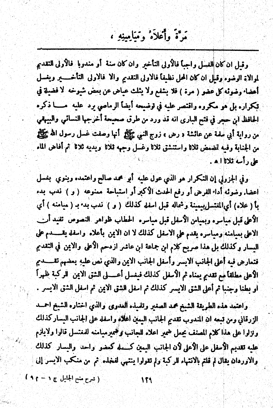 ـــــــــــــــــــــــــــــQوَقِيلَ إنْ كَانَ الْغُسْلُ وَاجِبًا فَالْأَوْلَى التَّأْخِيرُ وَإِنْ كَانَ سُنَّةً أَوْ مَنْدُوبًا فَالْأَوْلَى التَّقْدِيمُ لِمُوَالَاةِ الْوُضُوءِ وَقِيلَ إنْ كَانَ الْمَحَلُّ نَظِيفًا فَالْأَوْلَى التَّقْدِيمُ وَإِلَّا فَالْأَوْلَى التَّأْخِيرُ وَيَغْسِلُ أَعْضَاءَ وُضُوئِهِ كُلَّ عُضْوٍ (مَرَّةً) فَلَا يَشْفَعُ وَلَا يُثَلِّثُ عِيَاضٌ عَنْ بَعْضِ شُيُوخِهِ لَا فَضِيلَةَ فِي تَكْرَارِهِ بَلْ هُوَ مَكْرُوهٌ وَاقْتَصَرَ عَلَيْهِ فِي تَوْضِيحِهِ أَيْضًا الرَّمَاصِيُّ يَرِدُ عَلَيْهِ مَا ذَكَرَهُ الْحَافِظُ ابْنُ حَجَرٍ فِي فَتْحِ الْبَارِي أَنَّهُ قَدْ وَرَدَ مِنْ طُرُقٍ صَحِيحَةٍ أَخْرَجَهَا النَّسَائِيّ وَالْبَيْهَقِيُّ مِنْ رِوَايَةِ أَبِي سَلَمَةَ عَنْ عَائِشَةَ " - رَضِيَ اللَّهُ عَنْهَا - " زَوْجِ النَّبِيِّ - صَلَّى اللَّهُ عَلَيْهِ وَسَلَّمَ - «أَنَّهَا وَصَفَتْ غُسْلَ رَسُولِ اللَّهِ - صَلَّى اللَّهُ عَلَيْهِ وَسَلَّمَ - مِنْ الْجَنَابَةِ وَفِيهِ تَمَضْمَضَ ثَلَاثًا وَاسْتَنْشَقَ ثَلَاثًا وَغَسَلَ وَجْهَهُ ثَلَاثًا وَيَدَيْهِ ثَلَاثًا ثُمَّ أَفَاضَ الْمَاءَ عَلَى رَأْسِهِ ثَلَاثًا» اهـ. وَفِي الْجُزُولِيِّ إنَّ التَّكْرَارَ هُوَ الَّذِي عَوَّلَ عَلَيْهِ أَبُو مُحَمَّدٍ صَالِحٌ وَاعْتَمَدَهُ وَيَنْوِي بِغَسْلِ أَعْضَاءِ وُضُوئِهِ أَدَاءَ الْفَرْضِ أَوْ رَفْعَ الْحَدَثِ الْأَكْبَرِ أَوْ اسْتِبَاحَةَ مَمْنُوعِهِ (وَ) نُدِبَ بَدْءٌ بِ (أَعْلَاهُ) أَيْ الْمُغْتَسِلِ بِيَمِينِهِ وَشِمَالِهِ قَبْلَ أَسْفَلِهِ كَذَلِكَ (وَ) نُدِبَ بَدْءٌ بِ (مَيَامِنِهِ) أَيْ الْأَعْلَى قَبْلَ مَيَاسِرِهِ وَبِمَيَامِنِ الْأَسْفَلِ قَبْلَ مَيَاسِرِهِ الْحَطَّابُ ظَوَاهِرُ النُّصُوصِ تُفِيدُ أَنَّ الْأَعْلَى بِمَيَامِنِهِ وَمَيَاسِرِهِ يُقَدَّمُ عَلَى الْأَسْفَلِ كَذَلِكَ لَا أَنَّ الْأَيْمَنَ بِأَعْلَاهُ وَأَسْفَلَهُ يُقَدَّمُ عَلَى الْيَسَارِ وَكَذَلِكَ بَلْ هَذَا صَرِيحُ كَلَامِ ابْنِ جَمَاعَةَ ابْنُ عَاشِرٍ ازْدَحَمَ الْأَعْلَى وَالْأَيْمَنُ فِي التَّقْدِيمِ فَتَعَارَضَ فِيهِ أَعْلَى الْجَانِبِ الْأَيْسَرِ، وَأَسْفَلُ الْجَانِبِ الْأَيْمَنِ وَاَلَّذِي نَصَّ عَلَيْهِ بَعْضُهُمْ تَقْدِيمُ الْأَعْلَى مُطْلَقًا مَعَ تَقْدِيمِ يُمْنَاهُ ثُمَّ الْأَسْفَلِ كَذَلِكَ فَيَغْسِلُ أَعْلَى الشِّقِّ الْأَيْمَنِ لِلرُّكْبَةِ ظَهْرًا أَوْ بَطْنًا وَجَنْبًا ثُمَّ أَعْلَى الشِّقِّ الْأَيْسَرِ كَذَلِكَ ثُمَّ أَسْفَلَ الشِّقِّ الْأَيْمَنِ ثُمَّ أَسْفَلَ الشِّقِّ الْأَيْسَرِ. وَاعْتَمَدَ هَذِهِ الطَّرِيقَةَ الشَّيْخُ مُحَمَّدٌ الصَّغِيرُ وَتِلْمِيذُهُ الْعَدَوِيُّ وَاَلَّذِي اخْتَارَهُ الشَّيْخُ أَحْمَدُ الزَّرْقَانِيُّ وَمَنْ تَبِعَهُ أَنَّ الْمَنْدُوبَ تَقْدِيمُ الْجَانِبِ الْيَمِينِ أَعْلَاهُ وَأَسْفَلَهُ عَلَى الْجَانِبِ الْيَسَارِ كَذَلِكَ وَنَزَّلُوا عَلَى هَذَا كَلَامَ الْمُصَنِّفِ يُجْعَلُ ضَمِيرُ أَعْلَاهُ لِلْجَانِبِ وَضَمِيرُ مَيَامِنِهِ لِلْمُغْتَسِلِ قَالُوا: وَلَا يَلْزَمُ عَلَيْهِ تَقْدِيمُ الْأَسْفَلِ عَلَى الْأَعْلَى لِأَنَّ الْجَانِبَ الْيَمِينَ كُلَّهُ كَعُضْوٍ وَاحِدٍ وَالْيَسَارَ كَذَلِكَ وَإِلَّا وَرَدَ أَنْ يُقَالَ لِمَ قُلْتُمْ بِالِانْتِهَاءِ لِلرُّكْبَةِ وَلَمْ تَقُولُوا يَنْتَهِي لِفَخْذِهِ ثُمَّ مِنْ مَنْكِبِ الْأَيْسَرِ إلَى