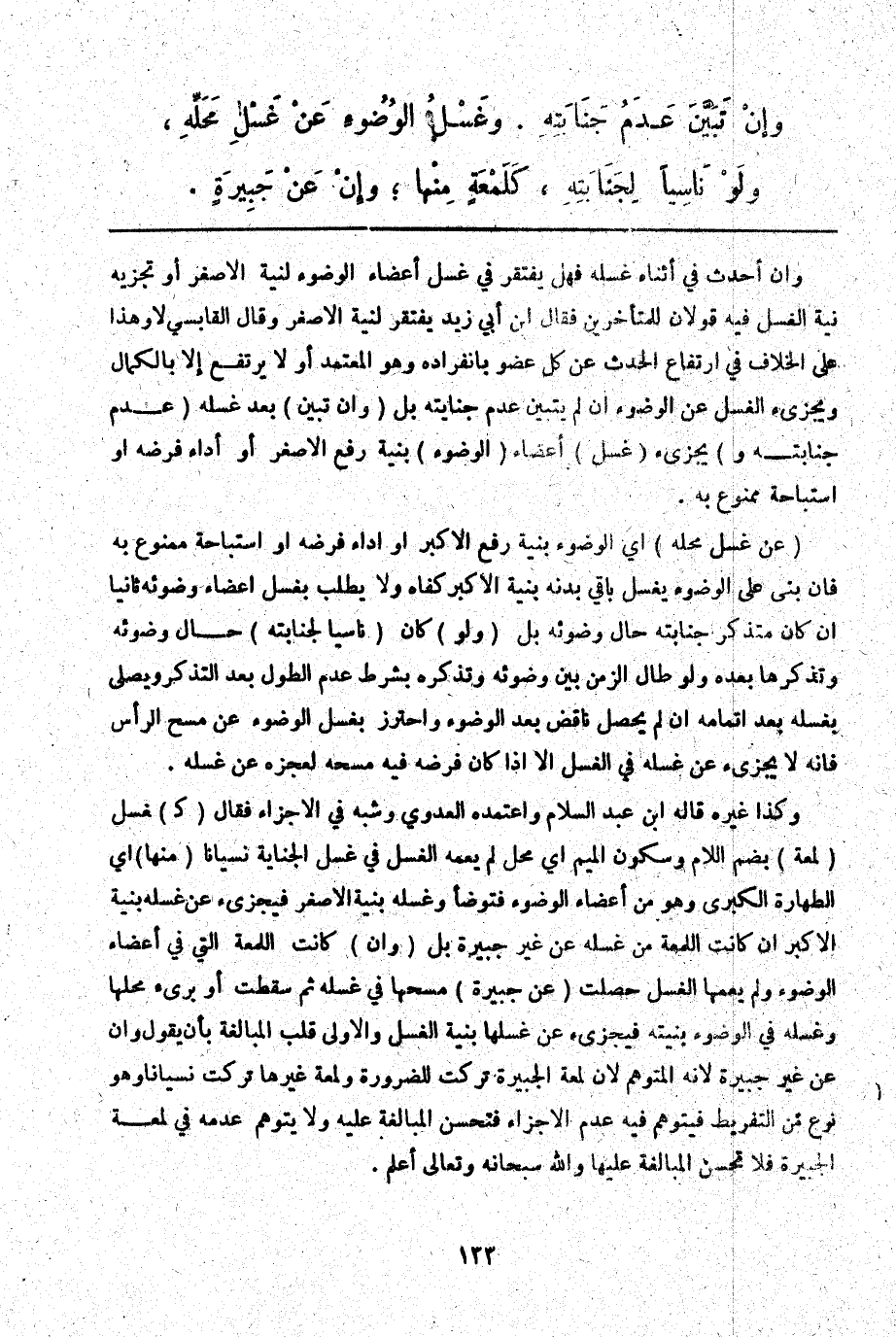 (عَنْ غَسْلِ مَحَلِّهِ) أَيْ الْوُضُوءِ بِنِيَّةِ رَفْعِ الْأَكْبَرِ أَوْ أَدَاءِ فَرْضِهِ أَوْ اسْتِبَاحَةِ مَمْنُوعٍ بِهِ فَإِنْ بَنَى عَلَى الْوُضُوءِ يَغْسِلُ بَاقِيَ بَدَنِهِ بِنِيَّةِ الْأَكْبَرِ كَفَاهُ وَلَا يُطْلَبُ بِغَسْلِ أَعْضَاءِ وُضُوئِهِ ثَانِيًا إنْ كَانَ مُتَذَكِّرَ جَنَابَتِهِ حَالَ وُضُوئِهِ بَلْ (وَلَوْ) كَانَ (نَاسِيًا لِجَنَابَتِهِ) حَالَ وُضُوئِهِ وَتَذَكَّرَهَا بَعْدَهُ وَلَوْ طَالَ الزَّمَنُ بَيْنَ وُضُوئِهِ وَتَذَكُّرِهِ بِشَرْطِ عَدَمِ الطُّولِ بَعْدَ التَّذَكُّرِ وَيُصَلِّي بِغُسْلِهِ بَعْدَ إتْمَامِهِ إنْ لَمْ يَحْصُلْ نَاقِضٌ بَعْدَ الْوُضُوءِ وَاحْتَرَزَ بِغُسْلِ الْوُضُوءِ عَنْ مَسْحِ الرَّأْسِ فَإِنَّهُ لَا يُجْزِئُ عَنْ غُسْلِهِ فِي الْغُسْلِ إلَّا إذَا كَانَ فَرْضُهُ فِيهِ مَسْحَهُ لِعَجْزِهِ عَنْ غُسْلِهِ. وَكَذَا غَيْرُهُ قَالَهُ ابْنُ عَبْدِ السَّلَامِ وَاعْتَمَدَهُ الْعَدَوِيُّ وَشَبَّهَ فِي الْإِجْزَاءِ فَقَالَ (كَ) غَسْلِ (لُمْعَةٍ) بِضَمِّ اللَّامِ وَسُكُونِ الْمِيمِ أَيْ مَحَلٍّ لَمْ يَعُمَّهُ الْغَسْلُ فِي غُسْلِ الْجِنَايَةِ نِسْيَانًا (مِنْهَا) أَيْ الطَّهَارَةِ الْكُبْرَى وَهُوَ مِنْ أَعْضَاءِ الْوُضُوءِ فَتَوَضَّأَ وَغَسَلَهُ بِنِيَّةِ الْأَصْغَرِ فَيُجْزِئُ عَنْ غُسْلِهِ بِنِيَّةِ الْأَكْبَرِ إنْ كَانَتْ اللُّمْعَةُ مِنْ غُسْلِهِ عَنْ غَيْرِ جَبِيرَةٍ بَلْ (وَإِنْ) كَانَتْ اللُّمْعَةُ الَّتِي فِي أَعْضَاءِ الْوُضُوءِ وَلَمْ يَعُمَّهَا الْغُسْلُ حَصَلَتْ (عَنْ جَبِيرَةٍ) مَسَحَهَا فِي غُسْلِهِ ثُمَّ سَقَطَتْ أَوْ بَرِئَ مَحَلُّهَا وَغُسْلُهُ فِي الْوُضُوءِ بِنِيَّتِهِ فَيُجْزِئُ عَنْ غُسْلِهَا بِنِيَّةِ الْغُسْلِ وَالْأَوْلَى قَلْبُ الْمُبَالَغَةِ بِأَنْ يَقُولَ: وَإِنْ عَنْ غَيْرِ جَبِيرَةٍ لِأَنَّهُ الْمُتَوَهَّمُ لِأَنَّ لُمْعَةَ الْجَبِيرَةِ تُرِكَتْ لِلضِّرْوَةِ وَلُمْعَةَ غَيْرِهَا تُرِكَتْ نِسْيَانًا وَهُوَ نَوْعٌ مِنْ التَّفْرِيطِ فَيُتَوَهَّمُ فِيهِ عَدَمُ الْإِجْزَاءِ فَتَحْسُنُ الْمُبَالَغَةُ عَلَيْهِ وَلَا يُتَوَهَّمُ عَدَمُهُ فِي لُمْعَةِ الْجَبِيرَةِ فَلَا تَحْسُنُ الْمُبَالَغَةُ عَلَيْهَا وَاَللَّهُ سُبْحَانَهُ وَتَعَالَى أَعْلَمُ.