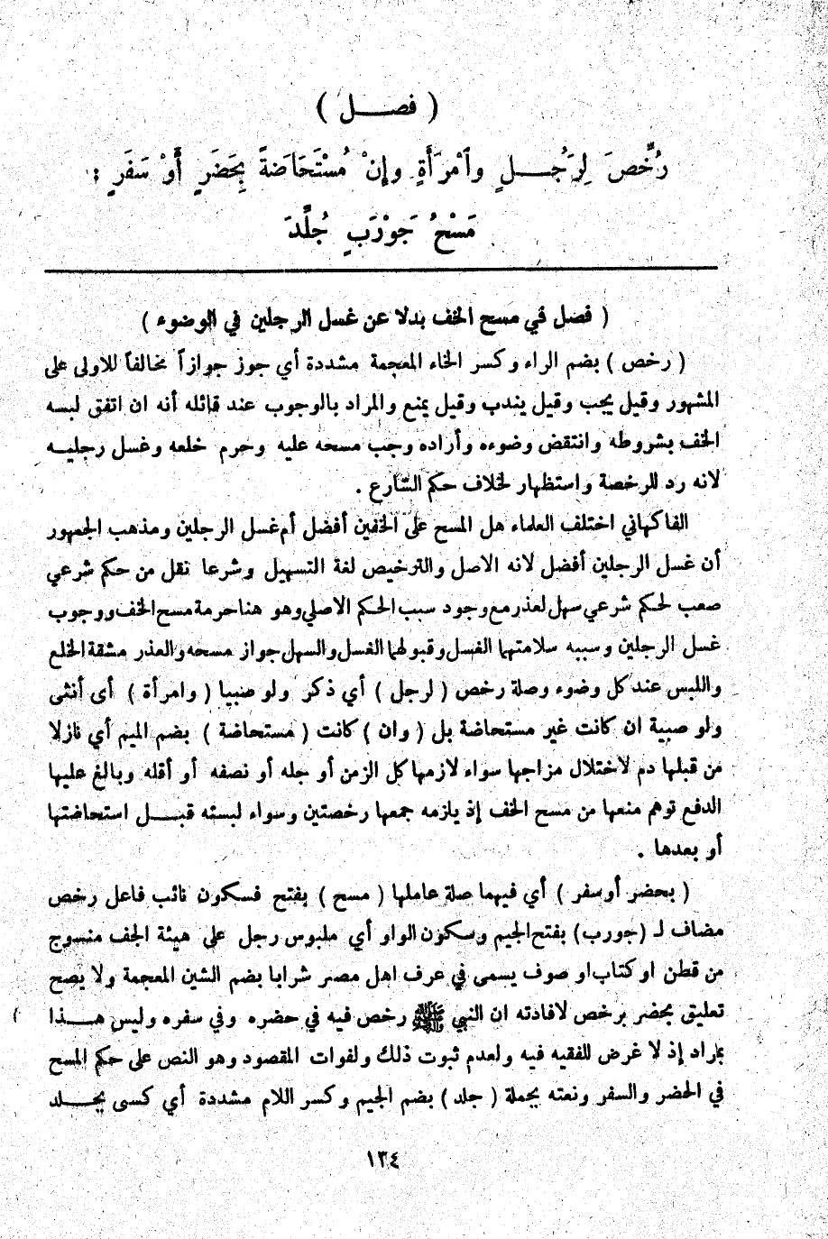 (فَصْلٌ فِي مَسْحِ الْخُفِّ بَدَلًا عَنْ غَسْلِ الرِّجْلَيْنِ فِي الْوُضُوءِ) (رُخِّصَ) بِضَمِّ الرَّاءِ وَكَسْرِ الْخَاءِ الْمُعْجَمَةِ مُشَدَّدَةً أَيْ جُوِّزَ جَوَازًا مُخَالِفًا لِلْأَوْلَى عَلَى الْمَشْهُورِ وَقِيلَ: يَجِبُ، وَقِيلَ: يُنْدَبُ وَقِيلَ: يُمْنَعُ وَالْمُرَادُ بِالْوُجُوبِ عِنْدَ قَائِلِهِ أَنَّهُ إنْ اتَّفَقَ لُبْسُهُ الْخُفَّ بِشُرُوطِهِ وَانْتَقَضَ وُضُوءُهُ وَأَرَادَهُ وَجَبَ مَسْحُهُ عَلَيْهِ وَحُرِّمَ خَلْعُهُ وَغَسَلَ رِجْلَيْهِ لِأَنَّهُ رَدٌّ لِلرُّخْصَةِ وَاسْتِظْهَارٌ لِخِلَافِ حُكْمِ الشَّارِعِ. الْفَاكِهَانِيُّ اخْتَلَفَ الْعُلَمَاءُ هَلْ الْمَسْحُ عَلَى الْخُفَّيْنِ أَفْضَلُ أَمْ غَسْلُ الرِّجْلَيْنِ؟ وَمَذْهَبُ الْجُمْهُورِ أَنَّ غَسْلَ الرِّجْلَيْنِ أَفْضَلُ لِأَنَّهُ الْأَصْلُ وَالتَّرْخِيصُ لُغَةً: التَّسَهُّلُ وَشَرْعًا: نَقْلٌ مِنْ حُكْمٍ شَرْعِيٍّ صَعْبٍ لِحُكْمٍ شَرْعِيٍّ سَهْلٍ لِعُذْرٍ مَعَ وُجُودِ سَبَبِ الْحُكْمِ الْأَصْلِيِّ وَهُوَ هُنَا حُرْمَةُ مَسْحِ الْخُفِّ وَوُجُوبُ غَسْلِ الرِّجْلَيْنِ وَسَبَبُهُ سَلَامَتُهُمَا مِنْ الْغُسْلِ وَقَبُولُهُمَا الْغُسْلَ وَالسَّهْلُ جَوَازُ مَسْحِهِ وَالْعُذْرُ مَشَقَّةُ الْخَلْعِ وَاللُّبْسِ عِنْدَ كُلِّ وُضُوءٍ وَصِلَةُ رُخِّصَ (لِرَجُلٍ) أَيْ ذَكَرٍ وَلَوْ صَبِيًّا (وَامْرَأَةٍ) أَيْ أُنْثَى وَلَوْ صَبِيَّةً إنْ كَانَتْ غَيْرَ مُسْتَحَاضَةٍ بَلْ (وَإِنْ) كَانَتْ (مُسْتَحَاضَةً) بِضَمِّ الْمِيمِ أَيْ نَازِلًا مِنْ قُبُلِهَا دَمٌ لِاخْتِلَالِ مِزَاجِهَا سَوَاءٌ لَازَمَهَا كُلَّ الزَّمَنِ أَوْ جُلَّهُ أَوْ نِصْفَهُ أَوْ أَقَلَّهُ وَبَالِغٍ عَلَيْهَا الدَّفْعُ تُوُهِّمَ مَنْعُهَا مِنْ مَسْحِ الْخُفِّ إذْ يَلْزَمُهُ جَمْعُهَا رُخْصَتَيْنِ وَسَوَاءٌ لَبِسَتْهُ قَبْلَ اسْتِحَاضَتِهَا أَوْ بَعْدَهَا.