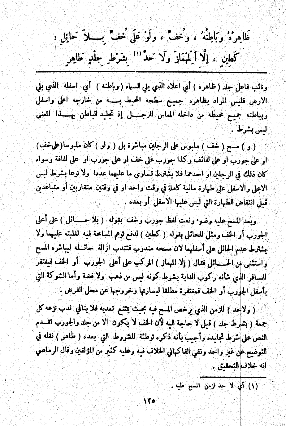 ـــــــــــــــــــــــــــــQوَنَائِبُ فَاعِلِ جُلِّدَ (ظَاهِرُهُ) أَيْ أَعْلَاهُ الَّذِي يَلِي السَّمَاءَ (وَبَاطِنُهُ) أَيْ أَسْفَلُهُ الَّذِي يَلِي الْأَرْضَ فَلَيْسَ الْمُرَادُ بِظَاهِرِهِ جَمِيعُ سَطْحِهِ الْمُحِيطِ بِهِ مِنْ خَارِجِهِ أَعْلَى وَأَسْفَلَ وَبِبَاطِنِهِ جَمِيعُ مُحِيطِهِ مِنْ دَاخِلِهِ الْمُمَاسِّ لِلرِّجْلِ إذْ تَجْلِيدُ الْبَاطِنِ بِهَذَا الْمَعْنَى لَيْسَ بِشَرْطٍ. (وَ) مَسْحِ (خُفٍّ) مَلْبُوسٍ عَلَى الرِّجْلَيْنِ مُبَاشَرَةً بَلْ (وَلَوْ) كَانَ مَلْبُوسًا (عَلَى خُفٍّ) أَوْ عَلَى جَوْرَبٍ أَوْ عَلَى لَفَائِفَ وَكَذَا جَوْرَبٌ عَلَى خُفٍّ أَوْ عَلَى جَوْرَبٍ أَوْ عَلَى لِفَافَةٍ وَسَوَاءٌ كَانَ ذَلِكَ فِي الرِّجْلَيْنِ أَوْ أَحَدِهِمَا فَلَا يُشْتَرَطُ تَسَاوِي مَا عَلَيْهِمَا عَدَدًا وَلَا نَوْعًا بِشَرْطِ لُبْسِ الْأَعْلَى وَالْأَسْفَلِ عَلَى طَهَارَةِ مَائِيَّةٍ كَامِلَةٍ فِي وَقْتٍ وَاحِدٍ أَوْ فِي وَقْتَيْنِ مُتَقَارِبَيْنِ أَوْ مُتَبَاعِدَيْنِ قَبْلَ انْتِقَاضِ الطَّهَارَةِ الَّتِي لَبِسَ عَلَيْهَا الْأَسْفَلَ أَوْ بَعْدَهُ. وَيُعَدُّ الْمَسْحُ عَلَيْهِ وُضُوءًا وَنَعَتَ لَفْظَ جَوْرَبٍ وَخُفٍّ بِقَوْلِهِ (بِلَا حَائِلٍ) عَلَى أَعْلَى الْجَوْرَبِ أَوْ الْخُفِّ وَمَثَّلَ لِلْحَائِلِ بِقَوْلِهِ (كَطِينٍ) لِدَفْعِ تَوَهُّمِ الْمُسَامَحَةِ فِيهِ لِغَلَبَتِهِ عَلَيْهِمَا وَلَا يُشْتَرَطُ عَدَمُ الْحَائِلِ عَلَى أَسْفَلِهِمَا لِأَنَّ مَسْحَهُ مَنْدُوبٌ فَتُنْدَبُ إزَالَةُ حَائِلِهِ لِيُبَاشِرَهُ الْمَسْحُ وَاسْتَثْنَى مِنْ الْحَائِلِ فَقَالَ (إلَّا الْمِهْمَازَ) الْمُرَكَّبَ عَلَى أَعْلَى الْجَوْرَبِ أَوْ الْخُفِّ فَيُغْتَفَرُ لِلْمُسَافِرِ الَّذِي شَأْنُهُ رُكُوبُ الدَّابَّةِ بِشَرْطِ كَوْنِهِ لَيْسَ مِنْ ذَهَبٍ وَلَا فِضَّةٍ وَأَمَّا الشَّوْكَةُ الَّتِي بِأَسْفَلَ الْجَوْرَبِ أَوْ الْخُفِّ فَمُغْتَفَرَةٌ مُطْلَقًا لِيَسَارَتِهَا وَخُرُوجِهَا عَنْ مَحَلِّ الْفَرْضِ.