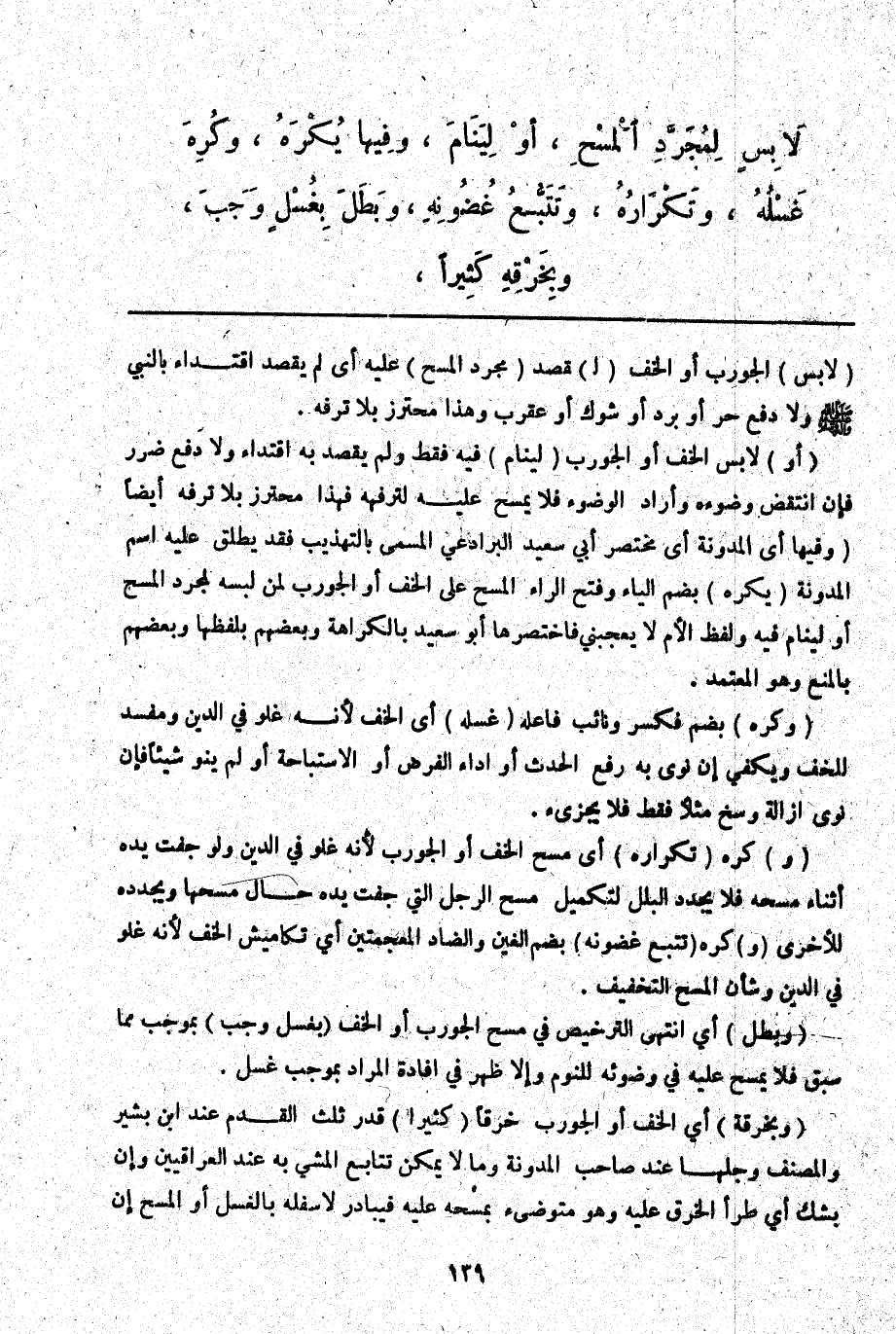 ـــــــــــــــــــــــــــــQ (لَابِسٍ) الْجَوْرَبَ أَوْ الْخُفَّ (لِ) قَصْدِ (مُجَرَّدِ الْمَسْحِ) عَلَيْهِ أَيْ لَمْ يَقْصِدْ اقْتِدَاءً بِالنَّبِيِّ - صَلَّى اللَّهُ عَلَيْهِ وَسَلَّمَ - وَلَا دَفْعَ حَرٍّ أَوْ بَرْدٍ أَوْ شَوْكٍ أَوْ عَقْرَبٍ وَهَذَا مُحْتَرَزٌ بِلَا تَرَفُّهٍ. (أَوْ) لَابِسٍ الْخُفَّ أَوْ الْجَوْرَبَ (لِيَنَامَ) فِيهِ فَقَطْ وَلَمْ يَقْصِدْ بِهِ اقْتِدَاءً وَلَا دَفْعَ ضَرَرٍ فَإِنْ اُنْتُقِضَ وُضُوءُهُ وَأَرَادَ الْوُضُوءَ فَلَا يَمْسَحُ عَلَيْهِ لِتَرَفُّهِهِ فَهَذَا مُحْتَرَزٌ بِلَا تَرَفُّهٍ أَيْضًا (وَفِيهَا) أَيْ الْمُدَوَّنَةِ أَيْ مُخْتَصَرِ أَبِي سَعِيدٍ الْبَرَادِعِيِّ الْمُسَمَّى بِالتَّهْذِيبِ فَقَدْ يُطْلَقُ عَلَيْهِ اسْمُ الْمُدَوَّنَةِ (يُكْرَهُ) بِضَمِّ الْيَاءِ وَفَتْحِ الرَّاءِ الْمَسْحُ عَلَى الْخُفِّ أَوْ الْجَوْرَبِ لِمَنْ لَبِسَهُ لِمُجَرَّدِ الْمَسْحِ أَوْ لِيَنَامَ فِيهِ وَلَفْظُ الْأُمِّ لَا يُعْجِبُنِي فَاخْتَصَرَهَا أَبُو سَعِيدٍ بِالْكَرَاهَةِ وَبَعْضُهُمْ بِلَفْظِهَا وَبَعْضُهُمْ بِالْمَنْعِ وَهُوَ الْمُعْتَمَدُ.