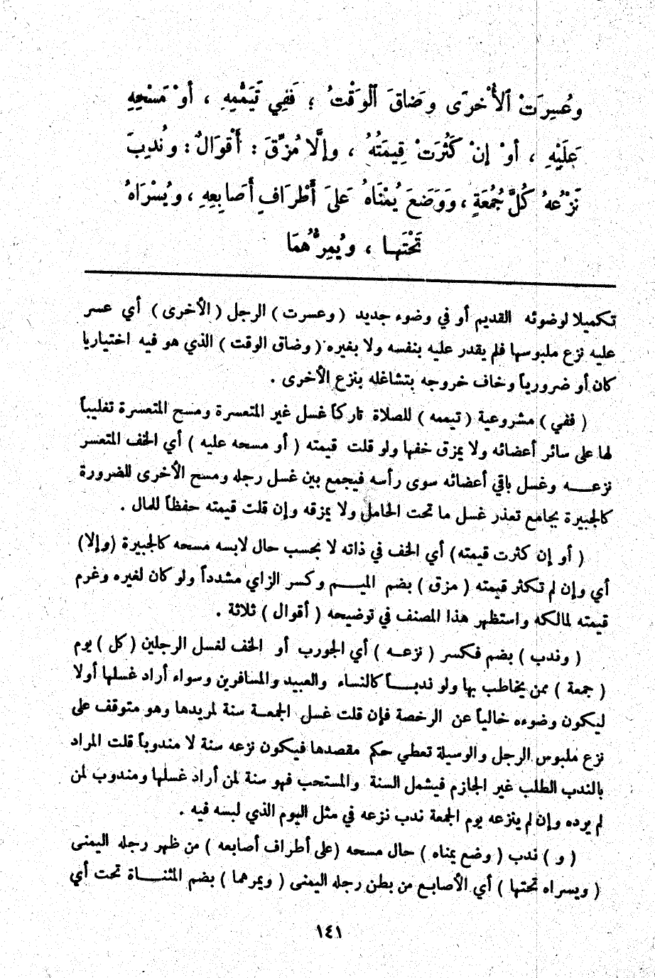 (وَنُدِبَ) بِضَمٍّ فَكَسْرٍ (نَزْعُهُ) أَيْ الْجَوْرَبِ أَوْ الْخُفِّ لِغَسْلِ الرِّجْلَيْنِ (كُلَّ) يَوْمِ (جُمُعَةٍ) مِمَّنْ يُخَاطَبُ بِهَا وَلَوْ نَدْبًا كَالنِّسَاءِ وَالْعَبِيدِ وَالْمُسَافِرِينَ وَسَوَاءٌ أَرَادَ غَسْلَهَا أَوْ لَا لِيَكُونَ وُضُوءُهُ خَالِيًا عَنْ الرُّخْصَةِ فَإِنْ قُلْت غُسْلُ الْجُمُعَةِ سُنَّةٌ لِمُرِيدِهَا وَهُوَ مُتَوَقِّفٌ عَلَى نَزْعِ مَلْبُوسِ الرِّجْلِ وَالْوَسِيلَةُ تُعْطَى حُكْمَ مَقْصِدِهَا فَيَكُونُ نَزْعُهُ سُنَّةً لَا مَنْدُوبًا قُلْت: الْمُرَادُ بِالنَّدْبِ الطَّلَبُ غَيْرُ الْجَازِمِ فَيَشْمَلُ السُّنَّةَ وَالْمُسْتَحَبَّ فَهُوَ سُنَّةٌ لِمَنْ أَرَادَ غَسْلَهَا وَمَنْدُوبٌ لِمَنْ لَمْ يُرِدْ وَإِنْ لَمْ يَنْزِعْهُ يَوْمَ الْجُمُعَةِ نُدِبَ نَزْعُهُ فِي مِثْلِ الْيَوْمِ الَّذِي لَبِسَهُ فِيهِ.