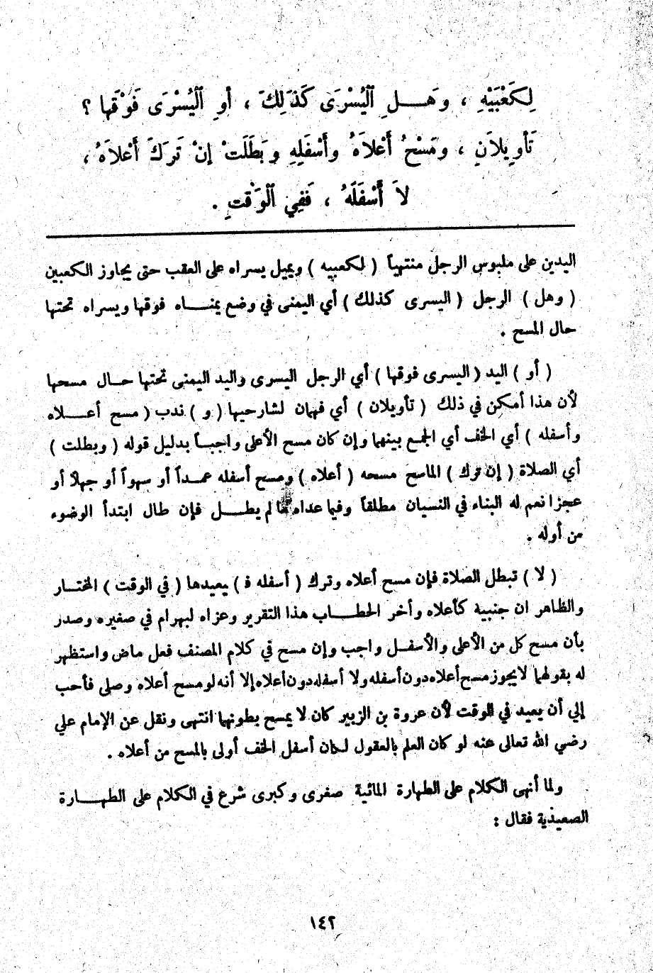 ـــــــــــــــــــــــــــــQالْيَدَيْنِ عَلَى مَلْبُوسِ الرِّجْلِ مُنْتَهِيًا (لِكَعْبَيْهِ) وَيُمِيلُ يُسْرَاهُ عَلَى الْعَقِبِ حَتَّى يُجَاوِزَ الْكَعْبَيْنِ (وَهَلْ) الرِّجْلُ (الْيُسْرَى كَذَلِكَ) أَيْ الْيُمْنَى فِي وَضْعِ يُمْنَاهُ فَوْقَهَا وَيُسْرَاهُ تَحْتَهَا حَالَ الْمَسْحِ.
