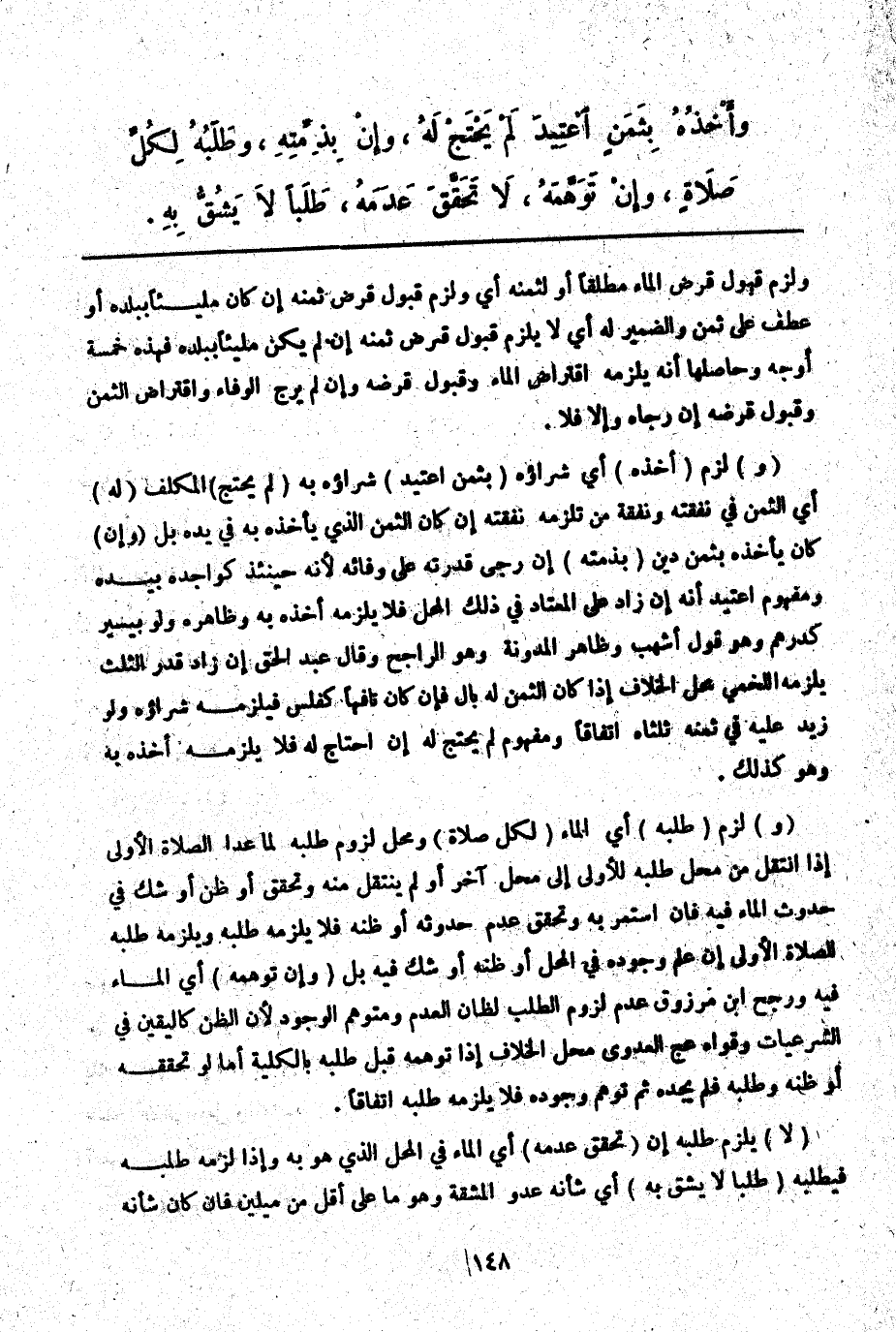 ـــــــــــــــــــــــــــــQوَلَزِمَ قَبُولُ قَرْضِ الْمَاءِ مُطْلَقًا أَوْ لِثَمَنِهِ أَيْ وَلَزِمَ قَبُولُ قَرْضِ ثَمَنِهِ إنْ كَانَ مَلِيئًا بِبَلَدِهِ أَوْ عَطْفٌ عَلَى ثَمَنٍ وَالضَّمِيرُ لَهُ أَيْ لَا يَلْزَمُ قَبُولُ قَرْضِ ثَمَنِهِ إنْ لَمْ يَكُنْ مَلِيئًا بِبَلَدِهِ فَهَذِهِ خَمْسَةُ أَوْجُهٍ وَحَاصِلُهَا أَنَّهُ يَلْزَمُهُ اقْتِرَاضُ الْمَاءِ وَقَبُولُ قَرْضِهِ وَإِنْ لَمْ يَرْجُ الْوَفَاءَ وَاقْتِرَاضُ الثَّمَنِ وَقَبُولُ قَرْضِهِ إنْ رَجَاهُ وَإِلَّا فَلَا.
