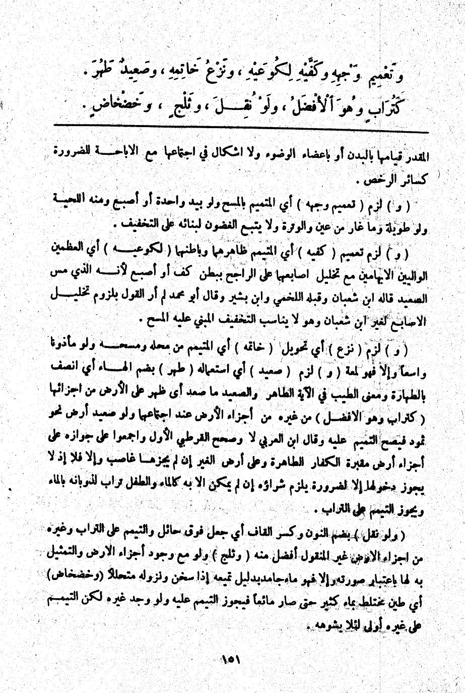 (وَ) لَزِمَ (نَزْعُ) أَيْ تَحْوِيلُ (خَاتَمِهِ) أَيْ الْمُتَيَمِّمِ مِنْ مَحَلِّهِ وَمَسْحُهُ وَلَوْ مَأْذُونًا وَاسِعًا وَإِلَّا فَهُوَ لُمْعَةٌ (وَ) لَزِمَ (صَعِيدٌ) أَيْ اسْتِعْمَالُهُ (طَهُرَ) بِضَمِّ الْهَاءِ أَيْ اتَّصَفَ بِالطَّهَارَةِ وَمَعْنَى الطَّيِّبِ فِي الْآيَةِ الطَّاهِرُ وَالصَّعِيدُ مَا صَعِدَ أَيْ ظَهَرَ عَلَى الْأَرْضِ مِنْ أَجْزَائِهَا (كَتُرَابٍ وَهُوَ الْأَفْضَلُ) مِنْ غَيْرِهِ مِنْ أَجْزَاءِ الْأَرْضِ عِنْدَ اجْتِمَاعِهِمَا وَلَوْ صَعِيدَ أَرْضٍ نَحْوَ ثَمُودٍ فَيَصِحُّ التَّيَمُّمُ عَلَيْهِ وَقَالَ ابْنُ الْعَرَبِيِّ: لَا وَصَحَّحَ الْقُرْطُبِيُّ الْأَوَّلَ وَأَجْمَعُوا عَلَى جَوَازِهِ عَلَى أَجْزَاءِ أَرْضِ مَقْبَرَةِ الْكُفَّارِ الطَّاهِرَةِ وَعَلَى أَرْضِ الْغَيْرِ إنْ لَمْ يَحُزْهَا غَاصِبٌ وَإِلَّا فَلَا إذْ لَا يَجُوزُ دُخُولُهَا إلَّا لِضَرُورَةٍ يَلْزَمُ شِرَاؤُهُ إنْ لَمْ يُمْكِنْ إلَّا بِهِ كَالْمَاءِ وَالطِّفْلِ تُرَابٌ لِذَوَبَانِهِ بِالْمَاءِ وَيَجُوزُ التَّيَمُّمُ عَلَى التُّرَاب.
