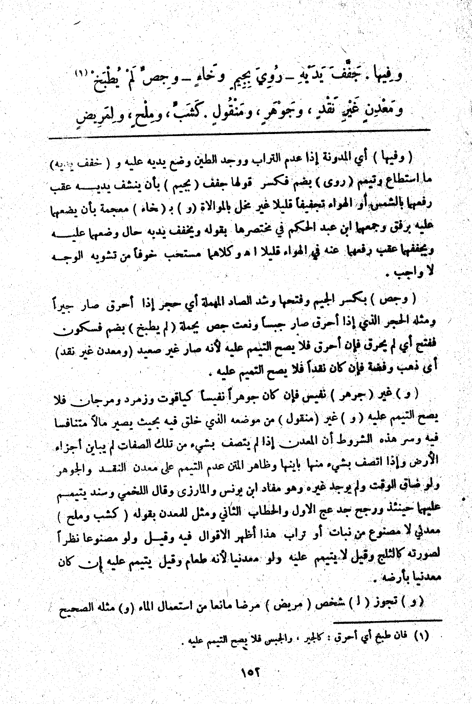(وَ) غَيْرِ (جَوْهَرٍ) نَفِيسٍ فَإِنْ كَانَ جَوْهَرًا نَفِيسًا كَيَاقُوتٍ وَزُمُرُّدٍ وَمَرْجَانِ فَلَا يَصِحُّ التَّيَمُّمُ عَلَيْهِ (وَ) غَيْرِ (مَنْقُولٍ) مِنْ مَوْضِعِهِ الَّذِي خُلِقَ فِيهِ بِحَيْثُ يَصِيرُ مَالًا مُتَنَافَسًا فِيهِ، وَسِرُّ هَذِهِ الشُّرُوطِ أَنَّ الْمَعْدِنَ إذَا لَمْ يَتَّصِفْ بِشَيْءٍ مِنْ تِلْكَ الصِّفَاتِ لَمْ يُبَايِنْ أَجْزَاءَ الْأَرْضِ وَإِذَا اتَّصَفَ بِشَيْءٍ مِنْهَا بَايَنَهَا وَظَاهِرُ الْمَتْنِ عَدَمُ التَّيَمُّمِ عَلَى مَعْدِنِ النَّقْدِ وَالْجَوْهَرِ، وَلَوْ ضَاقَ الْوَقْتُ وَلَمْ يُوجَدْ غَيْرُهُ وَهُوَ مُفَادُ ابْنِ يُونُسَ وَالْمَازِرِيِّ وَقَالَ اللَّخْمِيُّ وَسَنَدٌ يَتَيَمَّمُ عَلَيْهِمَا حِينَئِذٍ وَرَجَّحَ جَدّ عج الْأَوَّلَ وَالْحَطَّابُ الثَّانِيَ وَمَثَّلَ لِلْمَعْدِنِ بِقَوْلِهِ (كَشَبٍّ وَمِلْحٍ) مَعْدِنِيٍّ لَا مَصْنُوعٍ مِنْ نَبَاتٍ أَوْ تُرَابٍ هَذَا أَظْهَرُ الْأَقْوَالِ فِيهِ وَقِيلَ وَلَوْ مَصْنُوعًا نَظَرًا لِصُورَتِهِ كَالثَّلْجِ وَقِيلَ لَا يَتَيَمَّمُ عَلَيْهِ وَلَوْ مَعْدِنِيًّا لِأَنَّهُ طَعَامٌ، وَقِيلَ يَتَيَمَّمُ عَلَيْهِ إنْ كَانَ مَعْدِنِيًّا بِأَرْضِهِ.