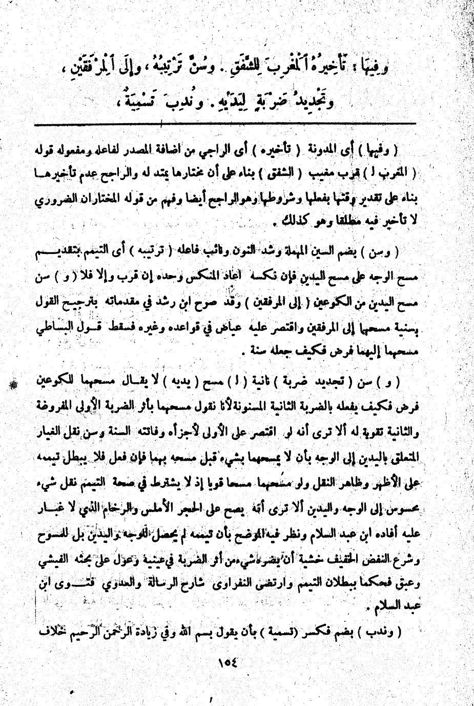 (وَسُنَّ) بِضَمِّ السِّينِ الْمُهْمَلَةِ وَشَدِّ النُّونِ وَنَائِبُ فَاعِلِهِ (تَرْتِيبُهُ) أَيْ التَّيَمُّمِ بِتَقْدِيمِ مَسْحِ الْوَجْهِ عَلَى مَسْحِ الْيَدَيْنِ فَإِنْ نَكَّسَهُ أَعَادَ الْمُنَكَّسَ وَحْدَهُ إنْ قَرُبَ وَإِلَّا فَلَا (وَ) سُنَّ مَسْحُ الْيَدَيْنِ مِنْ الْكُوعَيْنِ (إلَى الْمِرْفَقَيْنِ) وَقَدْ صَرَّحَ ابْنُ رُشْدٍ فِي مُقَدِّمَاتِهِ بِتَرْجِيحِ الْقَوْلِ بِسُنِّيَّةِ مَسْحِهِمَا إلَى الْمِرْفَقَيْنِ وَاقْتَصَرَ عَلَيْهِ عِيَاضٌ فِي قَوَاعِدِهِ وَغَيْرُهُ فَسَقَطَ قَوْلُ الْبِسَاطِيِّ مَسْحُهُمَا إلَيْهِمَا فَرْضٌ فَكَيْفَ جَعَلَهُ سُنَّةً.