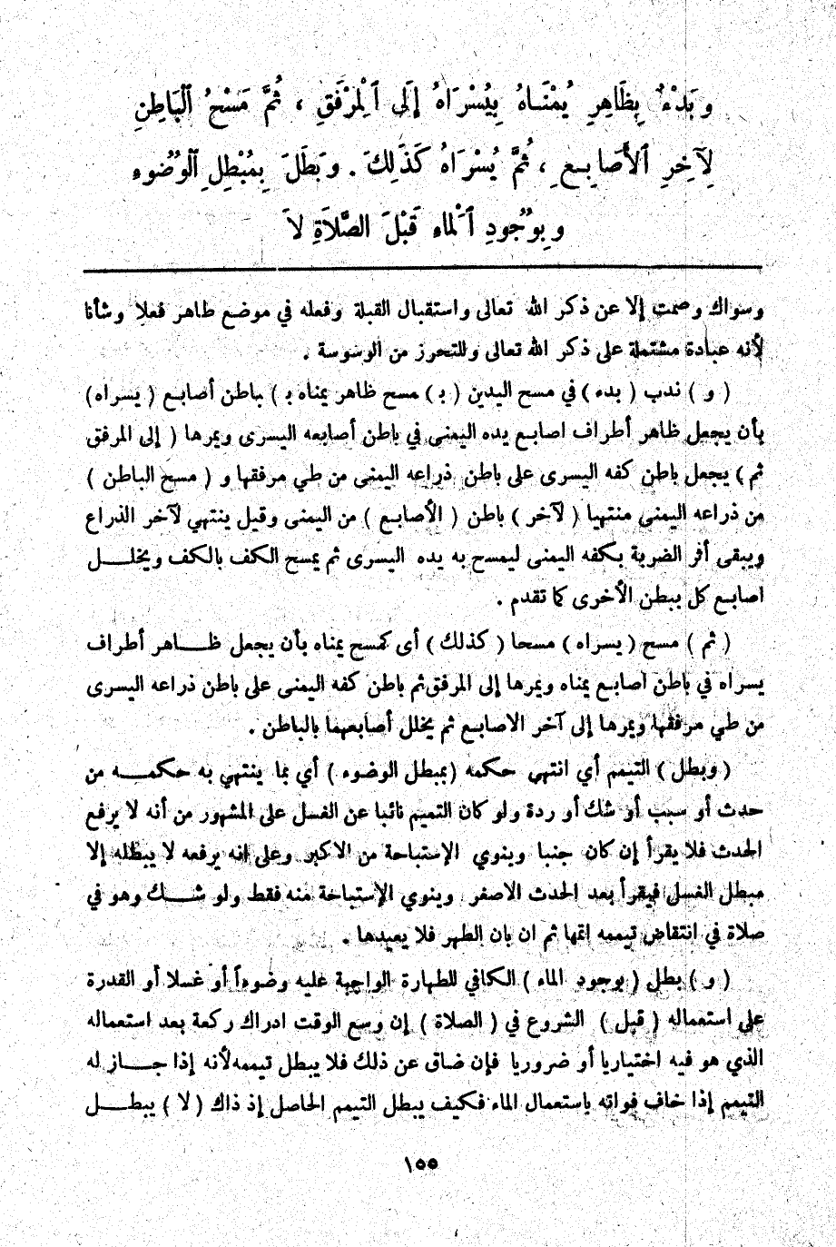 (وَ) نُدِبَ (بَدْءٌ) فِي مَسْحِ الْيَدَيْنِ (بِ) مَسْحِ ظَاهِرِ يُمْنَاهُ (بِ) بَاطِنِ أَصَابِعِ (يُسْرَاهُ) بِأَنْ يَجْعَلَ ظَاهِرَ أَطْرَافِ أَصَابِعِ يَدِهِ الْيُمْنَى فِي بَاطِنِ أَصَابِعِهِ الْيُسْرَى وَيُمِرُّهَا (إلَى الْمِرْفَقِ ثُمَّ) يَجْعَلُ بَاطِنَ كَفِّهِ الْيُسْرَى عَلَى بَاطِنِ ذِرَاعِهِ الْيُمْنَى مِنْ طَيِّ مِرْفَقِهَا وَ (مَسْحِ الْبَاطِنِ) مِنْ ذِرَاعِهِ الْيُمْنَى مُنْتَهِيًا (لِآخِرِ) بَاطِنِ (الْأَصَابِعِ) مِنْ الْيُمْنَى وَقِيلَ يَنْتَهِي لِآخِرِ الذِّرَاعِ وَيَبْقَى أَثَرُ الضَّرْبَةِ بِكَفِّهِ الْيُمْنَى لِيَمْسَحَ بِهِ يَدَهُ الْيُسْرَى ثُمَّ يَمْسَحُ الْكَفَّ بِالْكَفِّ وَيُخَلِّلُ أَصَابِعَ كُلٍّ بِبَطْنِ الْأُخْرَى كَمَا تَقَدَّمَ.