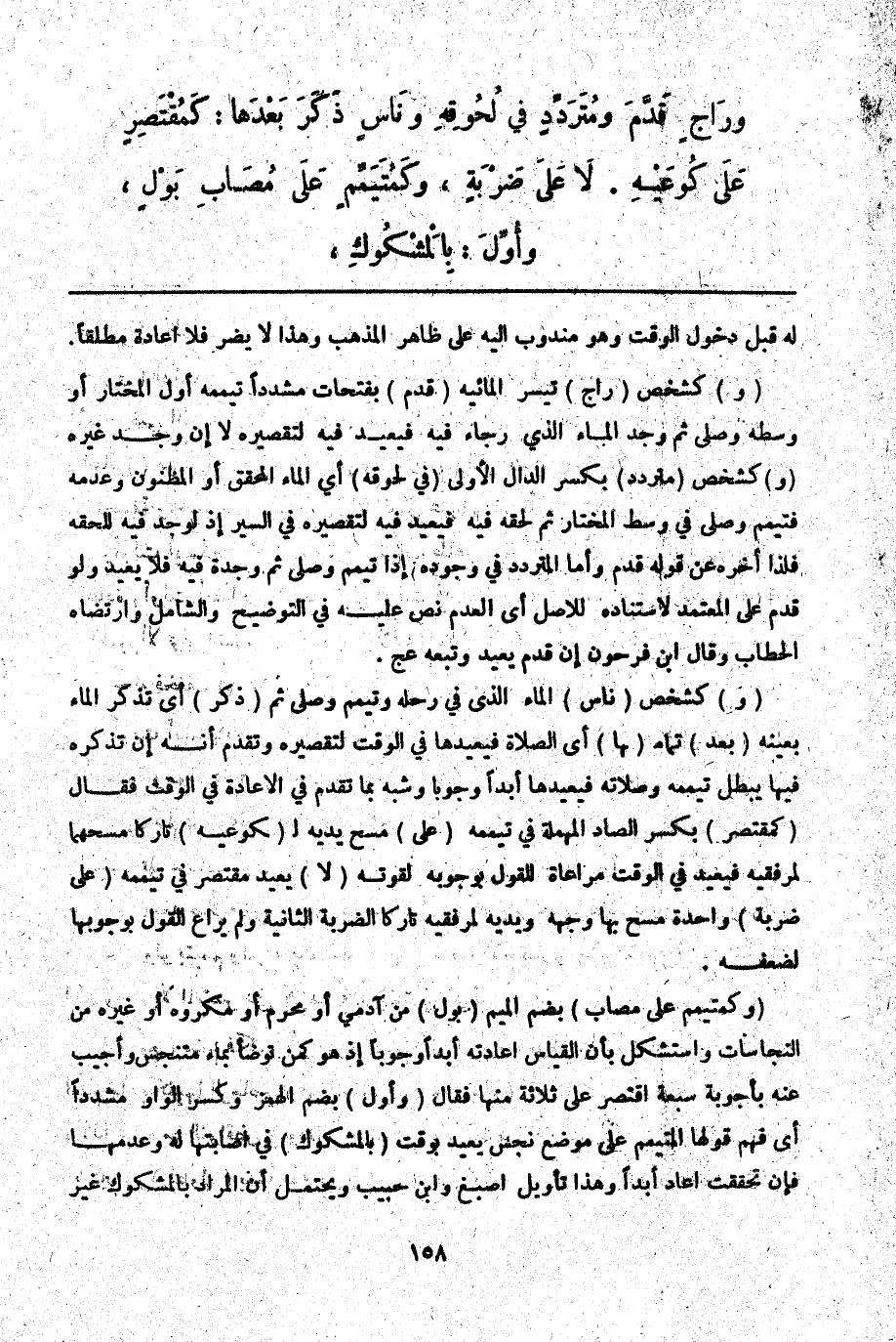 (وَ) كَشَخْصٍ (رَاجٍ) تَيَسُّرَ الْمَائِيَّةِ (قَدَّمَ) بِفَتَحَاتٍ مُشَدَّدًا تَيَمُّمَهُ أَوَّلَ الْمُخْتَارِ أَوْ وَسَطَهُ وَصَلَّى ثُمَّ وَجَدَ الْمَاءَ الَّذِي رَجَاهُ فِيهِ فَيُعِيدُ فِيهِ لِتَقْصِيرِهِ لَا إنْ وَجَدَ غَيْرَهُ (وَ) كَشَخْصٍ (مُتَرَدِّدٍ) بِكَسْرِ الدَّالِ الْأُولَى (فِي لُحُوقِهِ) أَيْ الْمَاءِ الْمُحَقَّقِ أَوْ الْمَظْنُونِ وَعَدِمَهُ فَتَيَمَّمَ وَصَلَّى فِي وَسَطِ الْمُخْتَارِ ثُمَّ لَحِقَهُ فِيهِ فَيُعِيدُ فِيهِ لِتَقْصِيرِهِ فِي السَّيْرِ إذْ لَوْ وُجِدَ فِيهِ لَلَحِقَهُ فَلِذَا أَخَّرَهُ عَنْ قَوْلِهِ قَدَّمَ وَأَمَّا الْمُتَرَدِّدُ فِي وُجُودِهِ إذَا تَيَمَّمَ وَصَلَّى ثُمَّ وَجَدَهُ فِيهِ فَلَا يُعِيدُ وَلَوْ قَدَّمَ عَلَى الْمُعْتَمَدِ لِاسْتِنَادِهِ لِلْأَصْلِ أَيْ الْعَدَمِ نَصَّ عَلَيْهِ فِي التَّوْضِيحِ وَالشَّامِلِ وَارْتَضَاهُ الْحَطَّابُ وَقَالَ ابْنُ فَرْحُونٍ إنْ قَدَّمَ يُعِيدُ وَتَبِعَهُ عج.