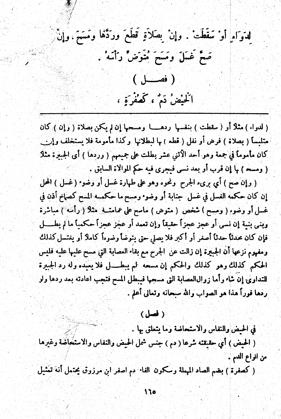 فِي الْحَيْضِ وَالنِّفَاسِ وَالِاسْتِحَاضَةِ وَمَا يَتَعَلَّقُ بِهَا (الْحَيْضُ) أَيْ حَقِيقَتُهُ شَرْعًا (دَمٌ) جِنْسٌ شَمِلَ الْحَيْضَ وَالنِّفَاسَ وَالِاسْتِحَاضَةَ وَغَيْرَهَا مِنْ أَنْوَاعِ الدَّمِ. (كَصُفْرَةٍ) بِضَمِّ الصَّادِ الْمُهْمَلَةِ وَسُكُونِ الْفَاءِ: دَمٌ أَصْفَرُ ابْنُ مَرْزُوقٍ يَحْتَمِلُ أَنَّهُ تَمْثِيلٌ