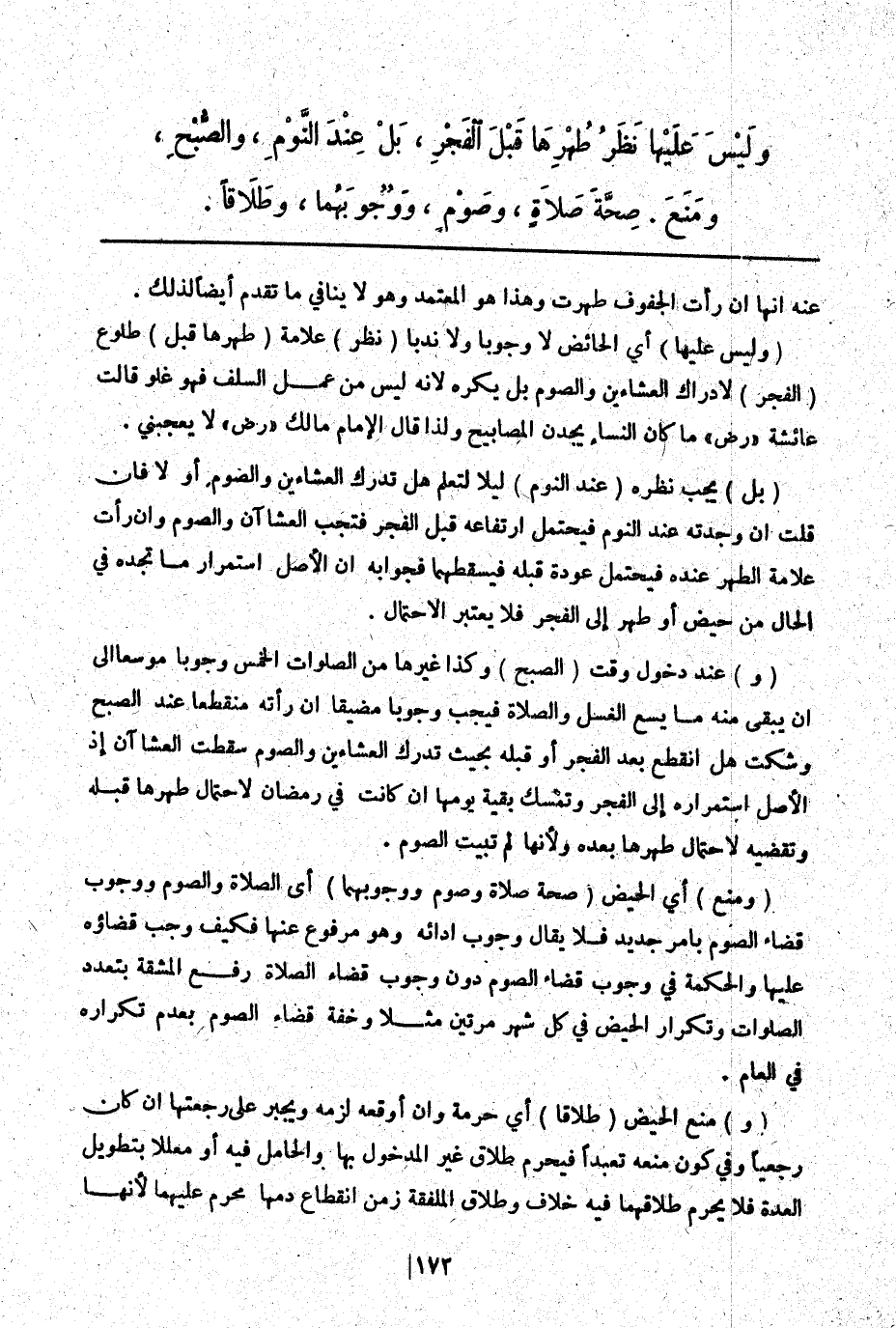 ـــــــــــــــــــــــــــــQعَنْهُ أَنَّهَا إنْ رَأَتْ الْجُفُوفَ طَهُرَتْ وَهَذَا هُوَ الْمُعْتَمَدُ وَهُوَ لَا يُنَافِي مَا تَقَدَّمَ أَيْضًا لِذَلِكَ (وَلَيْسَ عَلَيْهَا) أَيْ الْحَائِضِ لَا وُجُوبًا وَلَا نَدْبًا (نَظَرُ) عَلَامَةِ (طُهْرِهَا قَبْلَ) طُلُوعِ (الْفَجْرِ) لِإِدْرَاكِ الْعِشَاءَيْنِ وَالصَّوْمِ بَلْ يُكْرَهُ لِأَنَّهُ لَيْسَ مِنْ عَمَلِ السَّلَفِ فَهُوَ غُلُوٌّ قَالَتْ عَائِشَةُ " - رَضِيَ اللَّهُ عَنْهَا - ": مَا كَانَ النِّسَاءُ يَجِدْنَ الْمَصَابِيحَ وَلِذَا قَالَ الْإِمَامُ مَالِكٌ " - رَضِيَ اللَّهُ عَنْهُ - " لَا يُعْجِبُنِي.