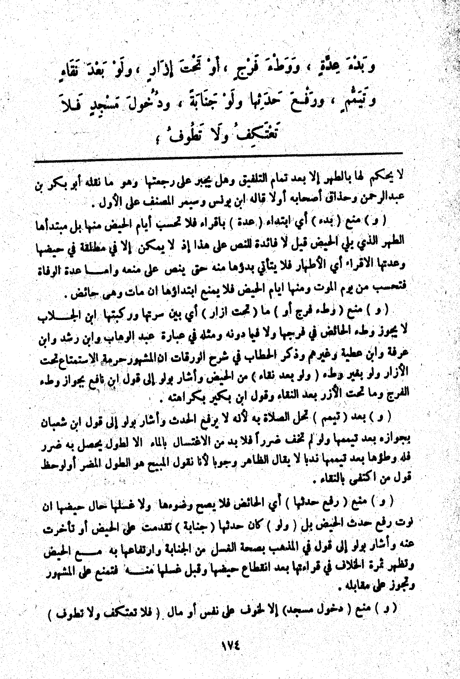 (وَ) مَنَعَ (وَطْءَ فَرْجٍ أَوْ) مَا (تَحْتَ إزَارٍ) أَيْ بَيْنَ سُرَّتِهَا وَرُكْبَتِهَا ابْنُ الْجَلَّابِ لَا يَجُوزُ وَطْءُ الْحَائِضِ فِي فَرْجِهَا وَلَا فِيمَا دُونَهُ وَمِثْلُهُ فِي عِبَارَةِ عَبْدِ الْوَهَّابِ وَابْنِ رُشْدٍ وَابْنِ عَرَفَةَ وَابْنِ عَطِيَّةَ وَغَيْرِهِمْ وَذَكَرَ الْحَطَّابُ فِي شَرْحِ الْوَرَقَاتِ أَنَّ الْمَشْهُورَ حُرْمَةُ الِاسْتِمْتَاعِ تَحْتَ الْإِزَارِ وَلَوْ بِغَيْرِ وَطْءٍ (وَلَوْ بَعْدَ نَقَاءٍ) مِنْ الْحَيْضِ وَأَشَارَ بِ وَلَوْ إلَى قَوْلِ ابْنِ نَافِعٍ بِجَوَازِ وَطْءِ الْفَرْجِ وَمَا تَحْتَ الْإِزَارِ بَعْدَ النَّقَاءِ وَقَوْلِ ابْنِ بُكَيْر بِكَرَاهَتِهِ.