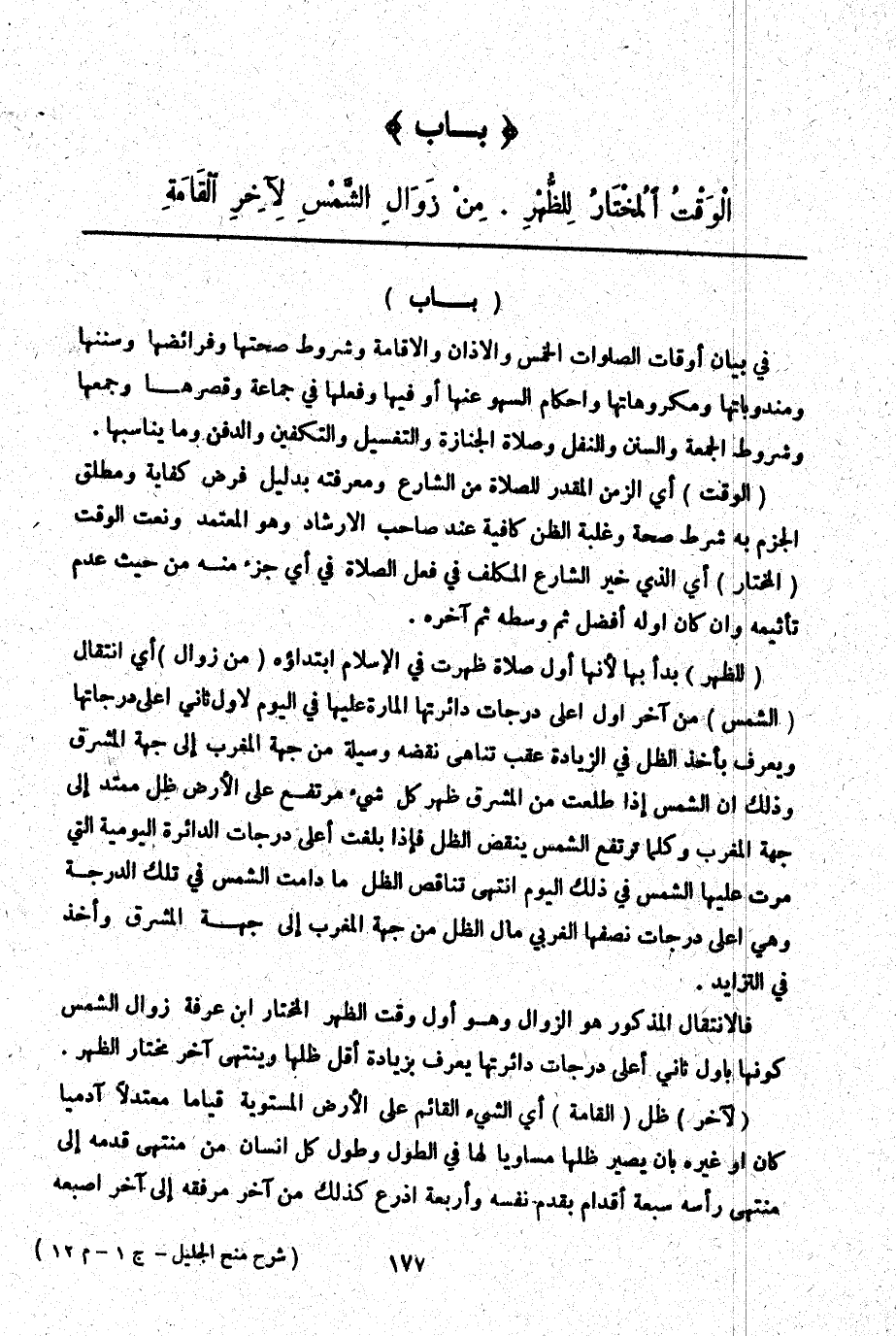 فَالِانْتِقَالُ الْمَذْكُورُ هُوَ الزَّوَالُ وَهُوَ أَوَّلُ وَقْتِ الظُّهْرِ الْمُخْتَارِ ابْنُ عَرَفَةَ: زَوَالُ الشَّمْسِ كَوْنُهَا بِأَوَّلِ ثَانِي أَعْلَى دَرَجَاتِ دَائِرَتِهَا يُعْرَفُ بِزِيَادَةِ أَقَلِّ ظِلِّهَا وَيَنْتَهِي آخِرُ مُخْتَارِ الظُّهْرِ.