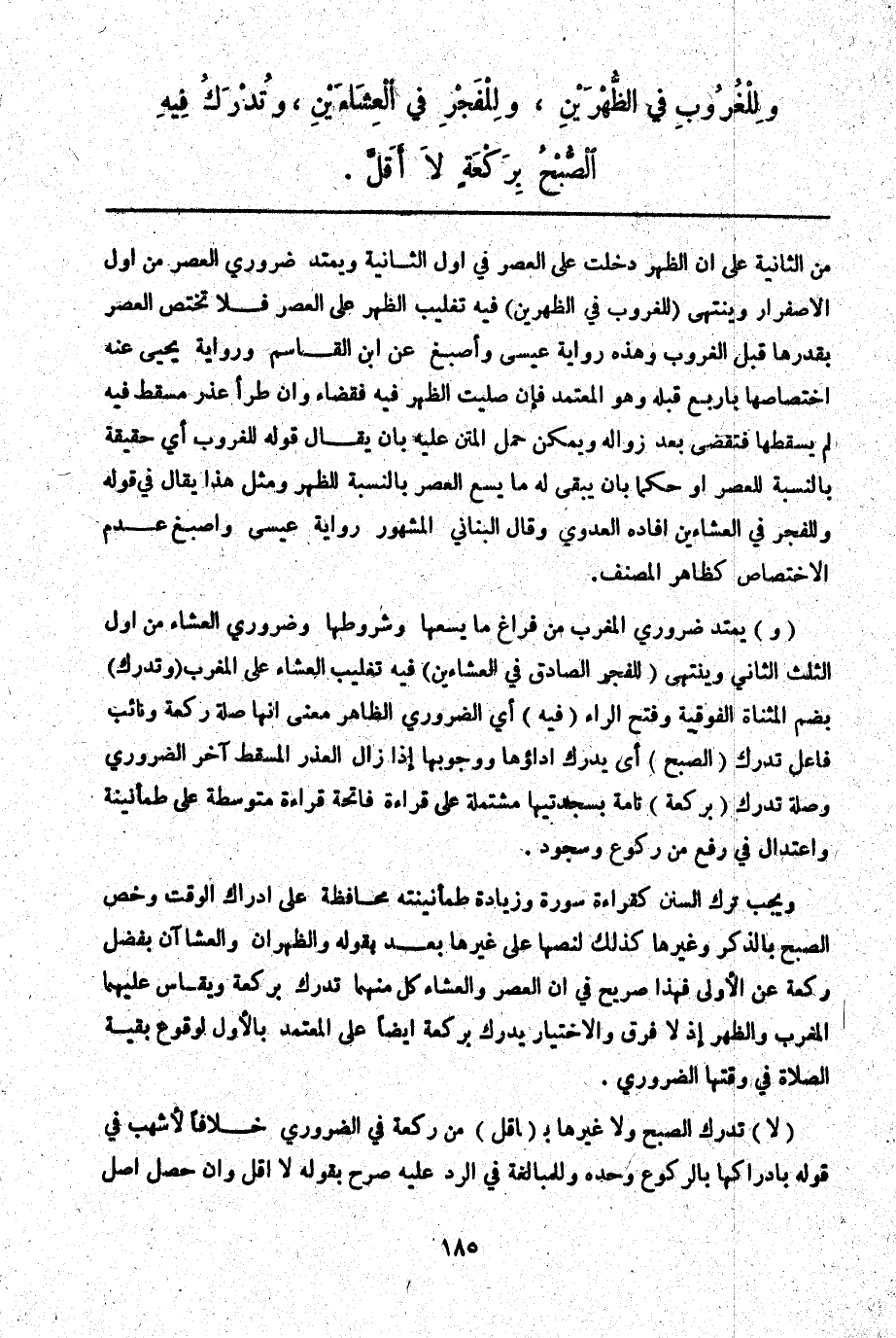 (لَا) تُدْرَكُ الصُّبْحُ وَلَا غَيْرُهَا بِ (أَقَلَّ) مِنْ رَكْعَةٍ فِي الضَّرُورِيِّ خِلَافًا لِأَشْهَبَ فِي قَوْلِهِ بِإِدْرَاكِهَا بِالرُّكُوعِ وَحْدَهُ وَلِلْمُبَالَغَةِ فِي الرَّدِّ عَلَيْهِ صَرَّحَ بِقَوْلِهِ " لَا أَقَلَّ " وَإِنْ حَصَلَ أَصْلُ