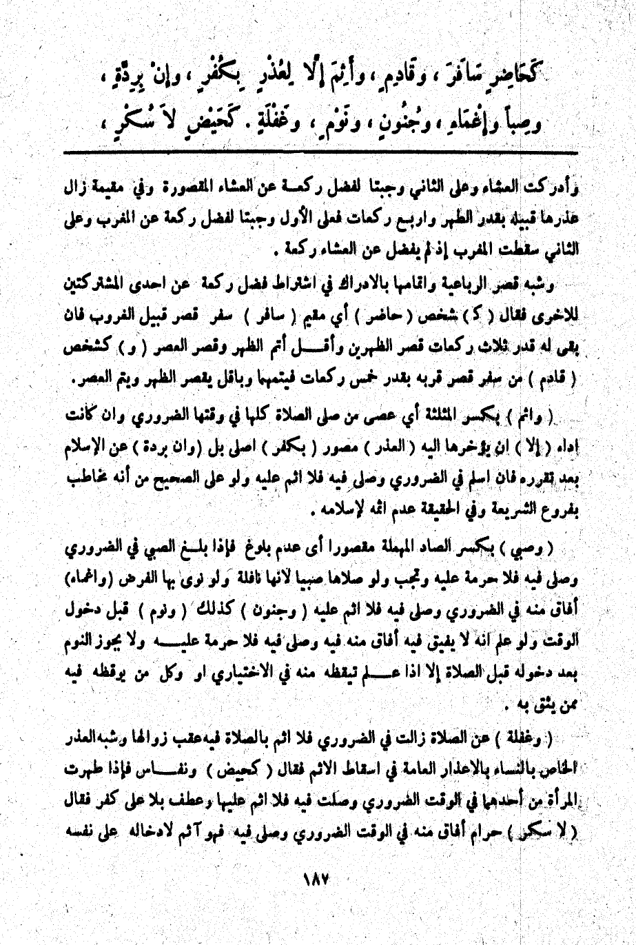وَشَبَّهَ قَصْرَ الرُّبَاعِيَّةِ وَإِتْمَامَهَا بِالْإِدْرَاكِ فِي اشْتِرَاطِ فَضْلِ رَكْعَةٍ عَنْ إحْدَى الْمُشْتَرَكَتَيْنِ لِلْأُخْرَى فَقَالَ (كَ) شَخْصٍ (حَاضِرٍ) أَيْ مُقِيمٍ (سَافَرَ) سَفَرَ قَصْرٍ قُبَيْلَ الْغُرُوبِ فَإِنْ بَقِيَ لَهُ قَدْرُ ثَلَاثِ رَكَعَاتٍ قَصَرَ الظُّهْرَيْنِ، وَأَقَلُّ أَتَمَّ الظُّهْرَ وَقَصَرَ الْعَصْرَ (وَ) كَشَخْصٍ (قَادِمٍ) مِنْ سَفَرِ قَصْرٍ قُرْبَهُ بِقَدْرِ خَمْسِ رَكَعَاتٍ فَيُتِمُّهُمَا وَبِأَقَلَّ يَقْصُرُ الظُّهْرَ وَيُتِمُّ الْعَصْرَ.