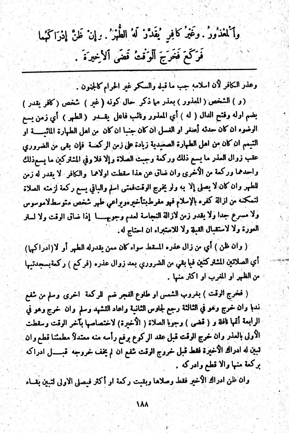 (وَ) الشَّخْصُ (الْمَعْذُورُ) بِعُذْرٍ مِمَّا ذُكِرَ حَالَ كَوْنِهِ (غَيْرَ) شَخْصٍ (كَافِرٍ يُقَدَّرُ) بِضَمِّ أَوَّلِهِ وَفَتْحِ الدَّالِ (لَهُ) أَيْ الْمَعْذُورِ وَنَائِبُ فَاعِلِ " يُقَدَّرُ " (الطُّهْرُ) أَيْ زَمَنٌ يَسَعُ الْوُضُوءَ إنْ كَانَ حَدَثُهُ أَصْغَرَ أَوْ الْغُسْلَ إنْ كَانَ جُنُبًا إنْ كَانَ مِنْ أَهْلِ الطَّهَارَةِ الْمَائِيَّةِ، أَوْ التَّيَمُّمَ إنْ كَانَ مِنْ أَهْلِ الطَّهَارَةِ الصَّعِيدِيَّةِ، زِيَادَةً عَلَى زَمَنِ الرَّكْعَةِ فَإِنْ بَقِيَ مِنْ الضَّرُورِيِّ عَقِبَ زَوَالِ الْعُذْرِ مَا يَسَعُ ذَلِكَ وَرَكْعَةً وَجَبَتْ الصَّلَاةُ وَإِلَّا فَلَا وَفِي الْمُشْتَرِكَيْنِ مَا يَسَعُ ذَلِكَ وَأَحَدَهُمَا وَرَكْعَةً مِنْ الْأُخْرَى وَإِنْ ضَاقَ عَنْ هَذَا سَقَطَتْ أُولَاهُمَا، وَالْكَافِرُ لَا يُقَدَّرُ لَهُ زَمَنٌ لِلطُّهْرِ وَإِنْ كَانَ لَا يُصَلِّي إلَّا بِهِ وَلَوْ يَخْرُجُ الْوَقْتُ فَمَتَى أَسْلَمَ وَالْبَاقِي يَسَعُ رَكْعَةً لَزِمَتْهُ الصَّلَاةُ لِتَمَكُّنِهِ مِنْ إزَالَةِ كُفْرِهِ بِالْإِسْلَامِ فَهُوَ مُفَرِّطٌ بِتَأْخِيرِهِ وَيُرَاعَى طُهْرُ شَخْصٍ مُتَوَسِّطٍ لَا مُوَسْوَسٍ وَلَا مُسْرِعٍ جِدًّا وَلَا يُقَدَّرُ زَمَنٌ لِإِزَالَةِ النَّجَاسَةِ لِعَدَمِ وُجُوبِهَا إذَا ضَاقَ الْوَقْتُ وَلَا لِسَتْرِ الْعَوْرَةِ وَلَا لِاسْتِقْبَالِ الْقِبْلَةِ وَلَا لِلِاسْتِبْرَاءِ إنْ احْتَاجَ لَهُ.