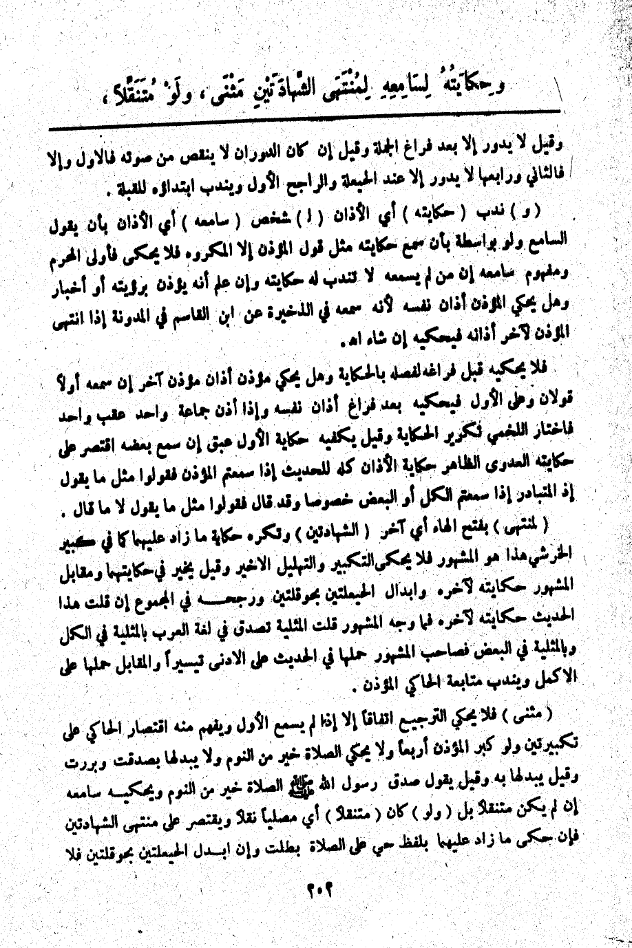 (لِمُنْتَهَى) بِفَتْحِ الْهَاءِ أَيْ آخِرِ (الشَّهَادَتَيْنِ) وَتُكْرَهُ حِكَايَةُ مَا زَادَ عَلَيْهِمَا كَمَا فِي كَبِيرِ الْخَرَشِيِّ هَذَا الْمَشْهُورُ فَلَا يُحْكَى التَّكْبِيرُ وَالتَّهْلِيلُ الْأَخِيرُ وَقِيلَ: يُخَيَّرُ فِي حِكَايَتِهِمَا وَمُقَابِلُ الْمَشْهُورِ حِكَايَتُهُ لِآخِرِهِ وَإِبْدَالُ الْحَيْعَلَتَيْنِ بِحَوْقَلَتَيْنِ وَرَجَّحَهُ فِي الْمَجْمُوعِ إنْ قُلْت هَذَا الْحَدِيثُ حِكَايَتُهُ لِآخِرِهِ فَمَا وَجْهُ الْمَشْهُورِ قُلْت: الْمِثْلِيَّةُ تَصْدُقُ فِي لُغَةِ الْعَرَبِ بِالْمِثْلِيَّةِ فِي الْكُلِّ وَبِالْمِثْلِيَّةِ فِي الْبَعْضِ فَصَاحِبُ الْمَشْهُورِ حَمَلَهَا فِي الْحَدِيثِ عَلَى الْأَدْنَى تَيْسِيرًا، وَالْمُقَابِلُ حَمَلَهَا عَلَى الْأَكْمَلِ وَيُنْدَبُ مُتَابَعَةُ الْحَاكِي الْمُؤَذِّنَ.