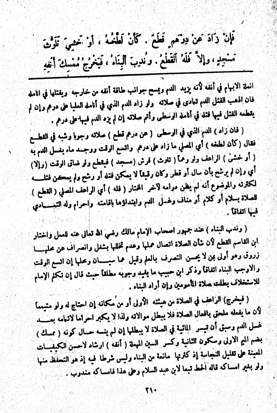 (فَإِنْ زَادَ) الدَّمُ الَّذِي فِي الْوُسْطَى (عَنْ دِرْهَمٍ قَطَعَ) صَلَاتَهُ وُجُوبًا وَشَبَّهَ فِي الْقَطْعِ فَقَالَ (كَأَنْ لَطَّخَهُ) أَيْ الْمُصَلِّي مَا زَادَ عَلَى دِرْهَمٍ وَاتَّسَعَ الْوَقْتُ وَوَجَدَ مَاءً يَغْسِلُ الدَّمَ بِهِ (أَوْ خَشِيَ) الرَّاعِفُ وَلَوْ وَهْمًا (تَلَوُّثَ) فَرْشِ (مَسْجِدٍ) فَيَقْطَعُ وَلَوْ ضَاقَ الْوَقْتُ (وَإِلَّا) أَيْ وَإِنْ لَمْ يَرْشَحْ بِأَنْ سَالَ أَوْ قَطَرَ وَكَانَ رَقِيقًا لَا يُمْكِنُ فَتْلُهُ أَوْ رَشَحَ وَلَمْ يُمْكِنْ فَتْلُهُ لِكَثْرَتِهِ وَالْمَوْضُوعُ أَنَّهُ لَمْ يَظُنَّ دَوَامَهُ لِآخِرِ الْمُخْتَارِ (فَلَهُ) أَيْ الرَّاعِفِ الْمُصَلِّي (الْقَطْعُ) لِلصَّلَاةِ بِسَلَامٍ أَوْ كَلَامٍ أَوْ مُنَافٍ وَغَسْلُ الدَّمِ وَابْتِدَاؤُهَا بِإِقَامَتِهِ وَإِحْرَامٍ وَلَهُ التَّمَادِي فِيهَا اتِّفَاقًا.