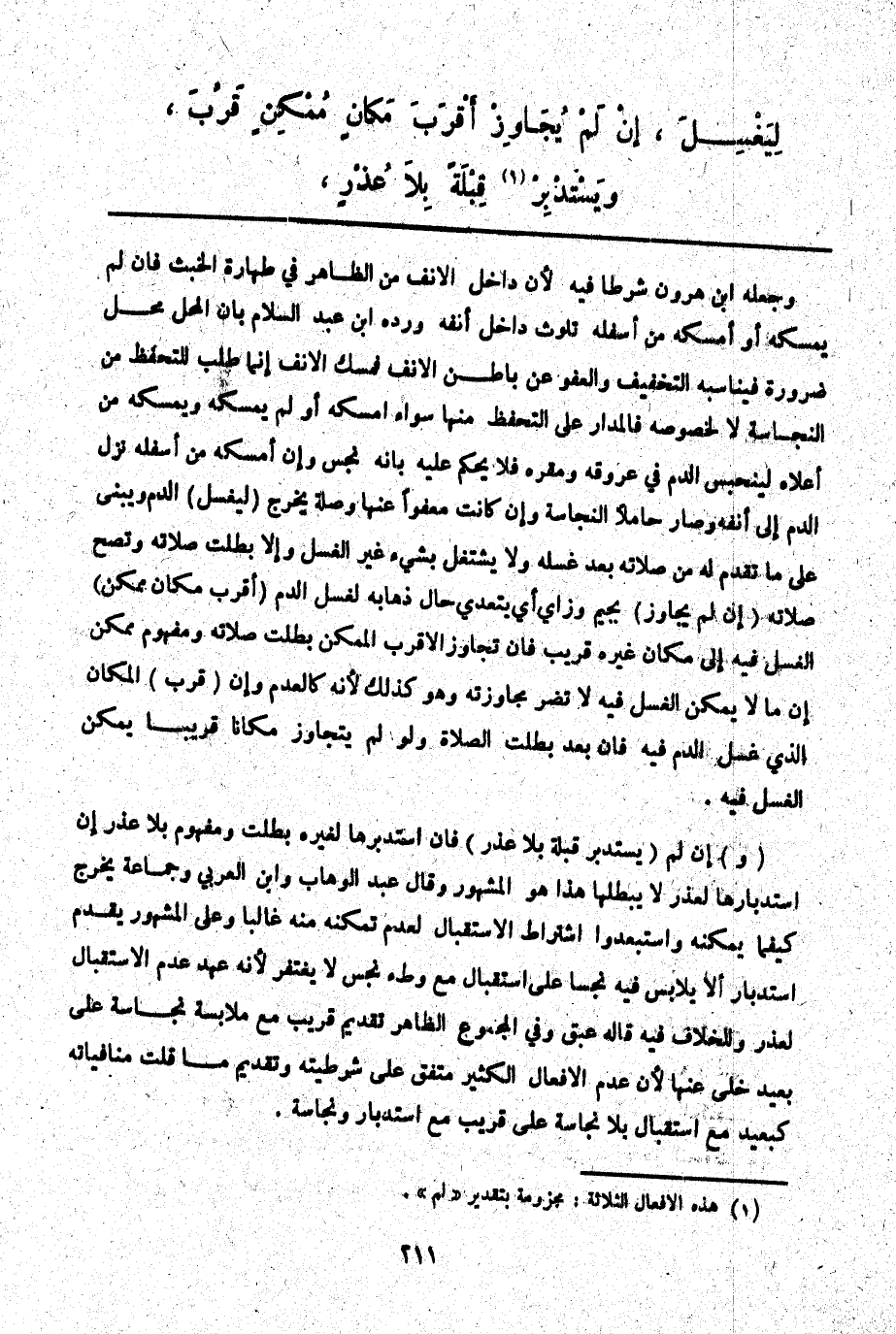 ـــــــــــــــــــــــــــــQوَجَعَلَهُ ابْنُ هَارُونَ شَرْطًا فِيهِ لِأَنَّ دَاخِلَ الْأَنْفِ مِنْ الظَّاهِرِ فِي طَهَارَةِ الْخَبَثِ فَإِنْ لَمْ يُمْسِكْهُ أَوْ أَمْسَكَهُ مِنْ أَسْفَلِهِ تَلَوَّثَ دَاخِلُ أَنْفِهِ وَرَدَّهُ ابْنُ عَبْدِ السَّلَامِ بِأَنَّ الْمَحَلَّ مَحَلُّ ضَرُورَةٍ فَيُنَاسِبُهُ التَّخْفِيفُ وَالْعَفْوُ عَنْ بَاطِنِ الْأَنْفِ فَمَسْكُ الْأَنْفِ إنَّمَا طَلَبٌ لِلتَّحَفُّظِ مِنْ النَّجَاسَةِ لَا لِخُصُوصِهِ فَالْمَدَارُ عَلَى التَّحَفُّظِ مِنْهَا سَوَاءٌ أَمْسَكَهُ أَوْ لَمْ يُمْسِكْهُ وَيُمْسِكُهُ مِنْ أَعْلَاهُ لِيُنَجِّسَ الدَّمَ فِي عُرُوقِهِ وَمَقَرِّهِ فَلَا يُحْكَمُ عَلَيْهِ بِأَنَّهُ نَجِسٌ وَإِنْ أَمْسَكَهُ مِنْ أَسْفَلِهِ نَزَلَ الدَّمُ إلَى أَنْفِهِ وَصَارَ حَامِلًا لِلنَّجَاسَةِ وَإِنْ كَانَتْ مَعْفُوًّا عَنْهَا وَصِلَةُ يَخْرُجُ (لِيَغْسِلَ) الدَّمَ وَيَبْنِي عَلَى مَا تَقَدَّمَ لَهُ مِنْ صَلَاتِهِ بَعْدَ غَسْلِهِ وَلَا يَشْتَغِلُ بِشَيْءٍ غَيْرَ الْغُسْلِ وَإِلَّا بَطَلَتْ صَلَاتُهُ وَتَصِحُّ صَلَاتُهُ (إنْ لَمْ يُجَاوِزْ) بِجِيمٍ وَزَايٍ أَيْ يَتَعَدَّى حَالَ ذَهَابِهِ لِغَسْلِ الدَّمِ (أَقْرَبَ مَكَان مُمْكِنٍ) الْغَسْلُ فِيهِ إلَى مَكَان غَيْرِهِ قَرِيبٍ فَإِنْ تَجَاوَزَ الْأَقْرَبَ الْمُمْكِنَ بَطَلَتْ صَلَاتُهُ وَمَفْهُومُ مُمْكِنٍ أَنَّ مَا لَا يُمْكِنُ الْغَسْلُ فِيهِ لَا تَضُرُّ مُجَاوَزَتُهُ وَهُوَ كَذَلِكَ لِأَنَّهُ كَالْعَدَمِ وَإِنْ (قَرُبَ) الْمَكَانُ الَّذِي غَسَلَ الدَّمَ فِيهِ فَإِنْ بَعُدَ بَطَلَتْ الصَّلَاةُ وَلَوْ لَمْ يَتَجَاوَزْ مَكَانًا قَرِيبًا يُمْكِنُ الْغَسْلُ فِيهِ.