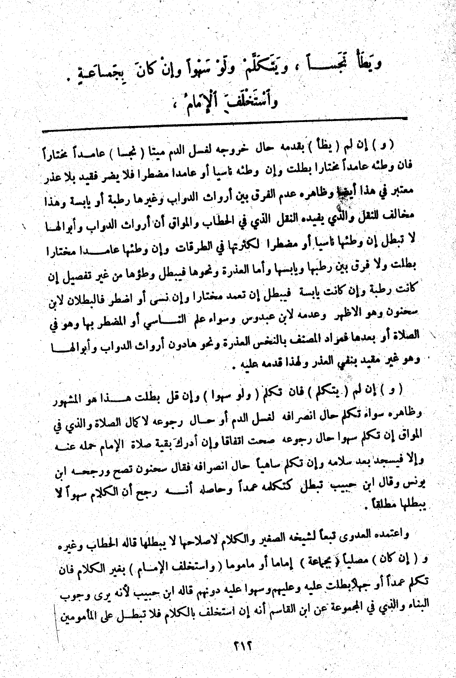 وَاعْتَمَدَهُ الْعَدَوِيُّ تَبَعًا لِشَيْخِهِ الصَّغِيرِ وَالْكَلَامُ لِإِصْلَاحِهَا لَا يُبْطِلُهَا قَالَهُ الْحَطَّابُ وَغَيْرُهُ وَ (إنْ كَانَ) مُصَلِّيًا (بِجَمَاعَةٍ) إمَامًا أَوْ مَأْمُومًا (وَاسْتَخْلَفَ الْإِمَامُ) بِغَيْرِ الْكَلَامِ فَإِنْ تَكَلَّمَ عَمْدًا أَوْ جَهْلًا بَطَلَتْ عَلَيْهِ وَعَلَيْهِمْ وَسَعَوْا عَلَيْهِ دُونَهُمْ قَالَهُ ابْنُ حَبِيبٍ لِأَنَّهُ يَرَى وُجُوبَ الْبِنَاءِ وَاَلَّذِي فِي الْمَجْمُوعَةِ عَنْ ابْنِ الْقَاسِمِ أَنَّهُ إنْ اسْتَخْلَفَ بِالْكَلَامِ فَلَا تَبْطُلُ عَلَى الْمَأْمُومِينَ