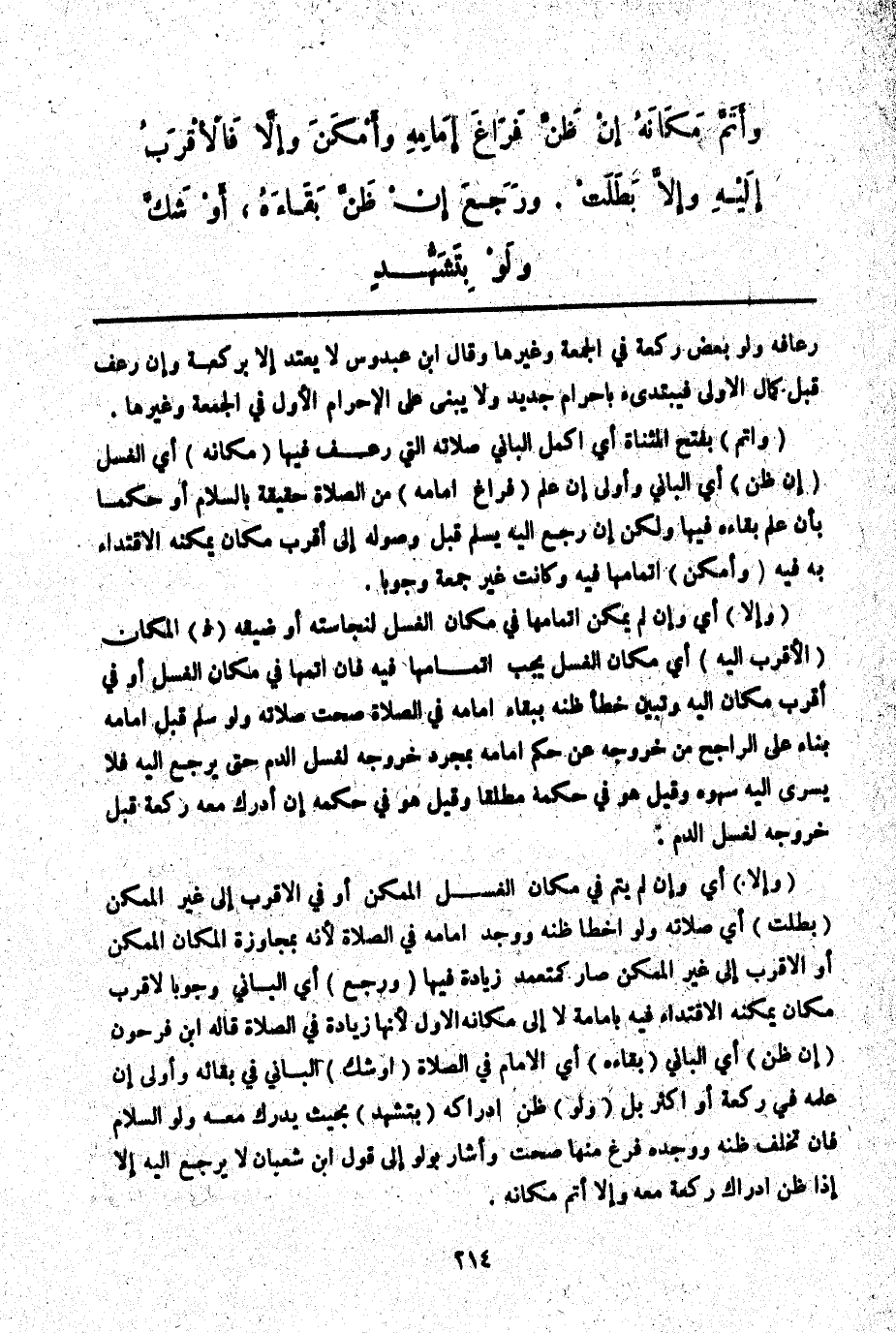 (وَإِلَّا) أَيْ وَإِنْ لَمْ يُتِمَّ فِي مَكَانِ الْغَسْلِ الْمُمْكِنِ أَوْ فِي الْأَقْرَبِ إلَى غَيْرِ الْمُمْكِنِ (بَطَلَتْ) أَيْ صَلَاتُهُ وَلَوْ أَخْطَأَ ظَنُّهُ وَوَجَدَ إمَامَهُ فِي الصَّلَاةِ لِأَنَّهُ بِمُجَاوَزَةِ الْمَكَانِ الْمُمْكِنِ أَوْ الْأَقْرَبِ إلَى غَيْرِ الْمُمْكِنِ صَارَ كَمُتَعَمِّدِ زِيَادَةٍ فِيهَا (وَرَجَعَ) أَيْ الْبَانِي وُجُوبًا لِأَقْرَبِ مَكَان يُمْكِنُهُ الِاقْتِدَاءُ فِيهِ بِإِمَامِهِ لَا إلَى مَكَانِهِ الْأَوَّلِ لِأَنَّهَا زِيَادَةٌ فِي الصَّلَاةِ قَالَهُ ابْنُ فَرْحُونٍ (إنْ ظَنَّ) أَيْ الْبَانِي (بَقَاءَهُ) أَيْ الْإِمَامِ فِي الصَّلَاةِ (أَوْ شَكَّ) الْبَانِي فِي بَقَائِهِ وَأَوْلَى إنْ عَلِمَهُ فِي رَكْعَةٍ أَوْ أَكْثَرَ بَلْ (وَلَوْ) ظَنَّ إدْرَاكَهُ (بِتَشَهُّدٍ) بِحَيْثُ يُدْرِكُ مَعَهُ وَلَوْ السَّلَامَ فَإِنْ تَخَلَّفَ ظَنُّهُ وَوَجَدَهُ فَرَغَ مِنْهَا صَحَّتْ وَأَشَارَ بِ " وَلَوْ " إلَى قَوْلِ ابْنِ شَعْبَانَ لَا يَرْجِعُ إلَيْهِ إلَّا إذَا ظَنَّ إدْرَاكَ رَكْعَةٍ مَعَهُ وَإِلَّا أَتَمَّ مَكَانَهُ.