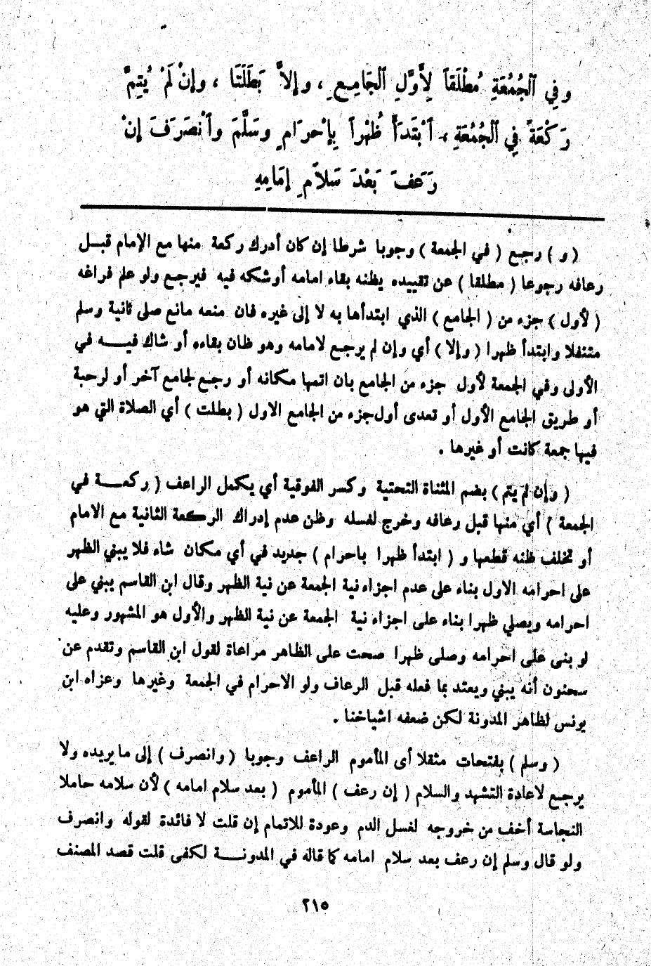 ـــــــــــــــــــــــــــــQ (وَ) رَجَعَ (فِي الْجُمُعَةِ) وُجُوبًا شَرْطًا إنْ كَانَ أَدْرَكَ رَكْعَةً مِنْهَا مَعَ الْإِمَامِ قَبْلَ رُعَافِهِ رُجُوعًا (مُطْلَقًا) عَنْ تَقْيِيدِهِ بِظَنِّهِ بَقَاءَ إمَامِهِ أَوْ شَكِّهِ فِيهِ فَيَرْجِعُ وَلَوْ عَلِمَ فَرَاغَهُ (لِأَوَّلِ) جُزْءٍ مِنْ (الْجَامِعِ) الَّذِي ابْتَدَأَهَا بِهِ لَا إلَى غَيْرِهِ فَإِنْ مَنَعَهُ مَانِعٌ صَلَّى ثَانِيَةً وَسَلَّمَ مُتَنَفِّلًا وَابْتَدَأَ ظُهْرًا (وَإِلَّا) أَيْ وَإِنْ لَمْ يَرْجِعْ لِإِمَامِهِ وَهُوَ ظَانٌّ بَقَاءَهُ أَوْ شَاكٌّ فِيهِ فِي الْأُولَى وَفِي الْجُمُعَةِ لِأَوَّلِ جُزْءٍ مِنْ الْجَامِعِ بِأَنْ أَتَمَّهَا مَكَانَهُ أَوْ رَجَعَ لِجَامِعٍ آخَرَ أَوْ لِرَحْبَةِ أَوْ طَرِيقِ الْجَامِعِ الْأَوَّلِ أَوْ تَعَدَّى أَوَّلَ جُزْءٍ مِنْ الْجَامِعِ الْأَوَّلِ (بَطَلَتْ) أَيْ الصَّلَاةُ الَّتِي هُوَ فِيهَا جُمُعَةً كَانَتْ أَوْ غَيْرَهَا.