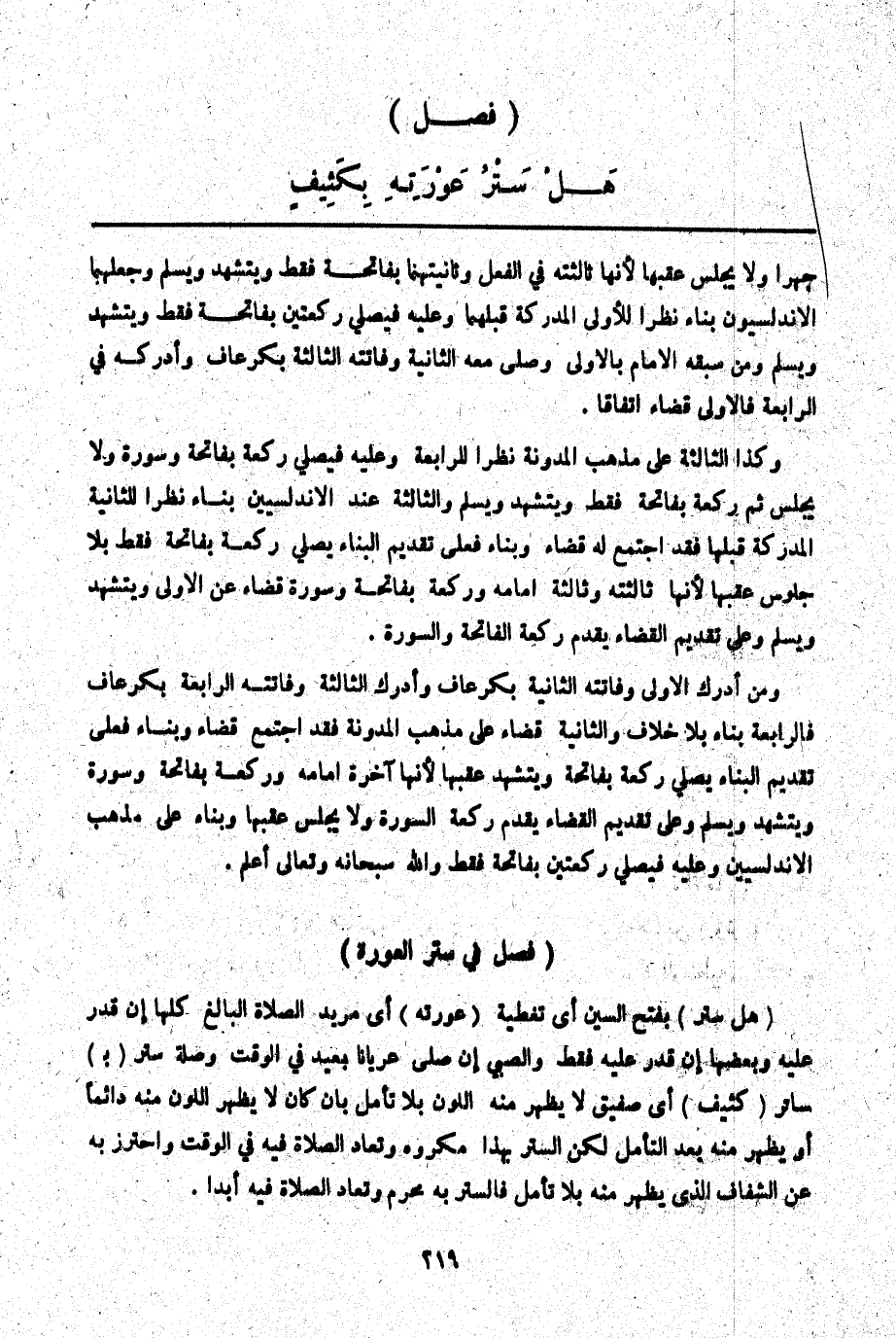 (فَصْلٌ فِي سَتْرِ الْعَوْرَةِ) (هَلْ سَتْرُ) بِفَتْحِ السِّينِ أَيْ تَغْطِيَةُ (عَوْرَتِهِ) أَيْ مَرِيدِ الصَّلَاةِ الْبَالِغِ كُلِّهَا إنْ قَدَرَ عَلَيْهِ وَبَعْضِهَا إنْ قَدَرَ عَلَيْهِ فَقَطْ وَالصَّبِيُّ إنْ صَلَّى عُرْيَانًا يُعِيدُ فِي الْوَقْتِ وَصِلَةُ سَتْرُ (بِ) سَاتِرٍ (كَثِيفٍ) أَيْ صَفِيقٍ لَا يَظْهَرُ مِنْهُ اللَّوْنُ بِلَا تَأَمُّلٍ بِأَنْ كَانَ لَا يَظْهَرُ اللَّوْنُ مِنْهُ دَائِمًا أَوْ يَظْهَرُ مِنْهُ بَعْدَ التَّأَمُّلِ لَكِنَّ السَّتْرَ بِهَذَا مَكْرُوهٌ وَتُعَادُ الصَّلَاةُ فِيهِ فِي الْوَقْتِ وَاحْتَرَزَ بِهِ عَنْ الشَّفَّافِ الَّذِي يَظْهَرُ مِنْهُ بِلَا تَأَمُّلٍ فَالسَّتْرُ بِهِ مُحَرَّمٌ وَتُعَادُ الصَّلَاةُ فِيهِ أَبَدًا.
