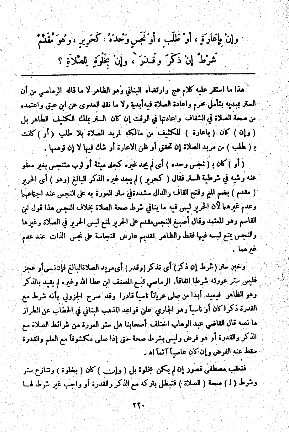 فَتَعَقَّبَ مُصْطَفَى قُصُورَ إنْ لَمْ يَكُنْ بِخَلْوَةٍ بَلْ (وَإِنْ) كَانَ (بِخَلْوَةٍ) وَتَنَازَعَ سَتْرٌ وَشَرْطٌ (لِ) صِحَّةِ (الصَّلَاةِ) فَتَبْطُلُ بِتَرْكِهِ مَعَ الذِّكْرِ وَالْقُدْرَةِ أَوْ وَاجِبٌ غَيْرُ شَرْطٍ لَهَا