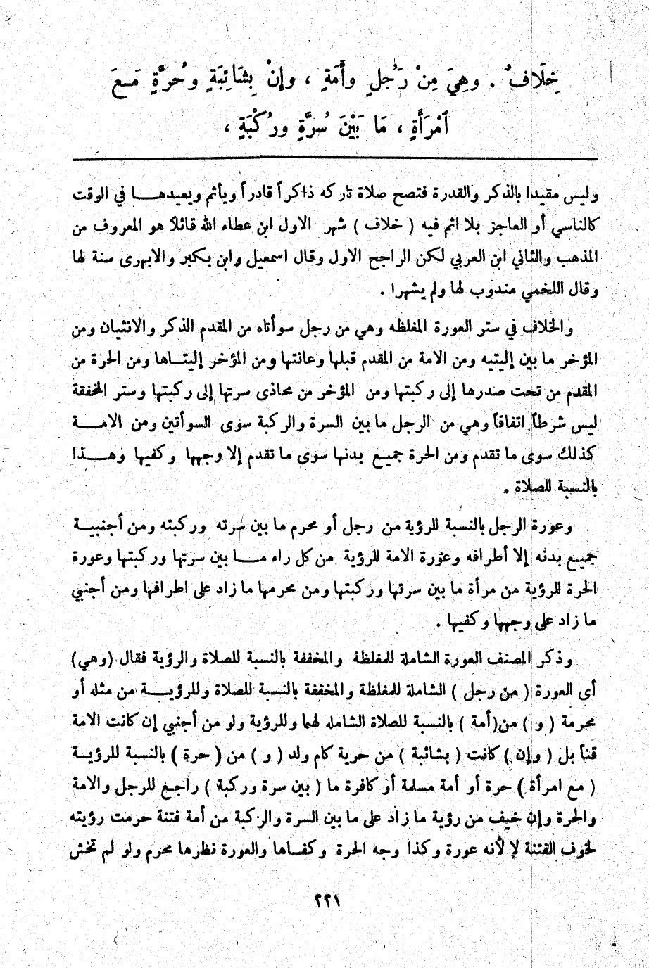 وَالْخِلَافُ فِي سَتْرِ الْعَوْرَةِ الْمُغَلَّظَةِ وَهِيَ مِنْ رَجُلٍ سَوْأَتَاهُ مِنْ الْمُقَدَّمِ الذَّكَرُ وَالْأُنْثَيَانِ وَمِنْ الْمُؤَخَّرِ مَا بَيْنَ أَلْيَتَيْهِ وَمِنْ الْأَمَةِ مِنْ الْمُقَدَّمِ قُبُلُهَا وَعَانَتُهَا وَمِنْ الْمُؤَخَّرِ أَلْيَتَاهَا وَمِنْ الْحُرَّةِ مِنْ الْمُقَدَّمِ مِنْ تَحْتِ صَدْرِهَا إلَى رُكْبَتِهَا وَمِنْ الْمُؤَخَّرِ مِنْ مُحَاذِي سُرَّتِهَا إلَى رُكْبَتِهَا وَسَتْرُ الْمُخَفَّفَةِ لَيْسَ شَرْطًا اتِّفَاقًا وَهِيَ مِنْ الرَّجُلِ مَا بَيْنَ السُّرَّةِ وَالرُّكْبَةِ سِوَى السَّوْأَتَيْنِ وَمِنْ الْأَمَةِ كَذَلِكَ سِوَى مَا تَقَدَّمَ وَمِنْ الْحُرَّةِ جَمِيعُ بَدَنِهَا سِوَى مَا تَقَدَّمَ إلَّا وَجْهَهَا وَكَفَّيْهَا وَهَذَا بِالنِّسْبَةِ لِلصَّلَاةِ.