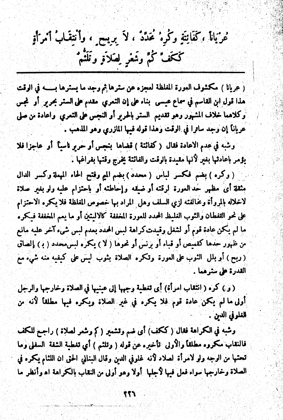 وَشَبَّهَ فِي الْكَرَاهَةِ فَقَالَ (كَكَفِّ) أَيْ ضَمِّ وَتَشْمِيرِ (كُمٍّ وَشَعْرٍ لِصَلَاةٍ) رَاجِعٌ لِلْكَفِّ فَالنِّقَابُ مَكْرُوهٌ مُطْلَقًا وَالْأَوْلَى تَأْخِيرُهُ عَنْ قَوْلِهِ (وَتَلَثُّمٌ) أَيْ تَغْطِيَةُ الشَّفَةِ السُّفْلَى وَمَا تَحْتَهَا مِنْ الْوَجْهِ وَلَوْ لِامْرَأَةٍ لِصَلَاةٍ لِأَنَّهُ غُلُوٌّ فِي الدِّينِ وَقَالَ الْبُنَانِيُّ الْحَقُّ إنَّ اللِّثَامَ يُكْرَهُ فِي الصَّلَاةِ وَخَارِجِهَا سَوَاءٌ فَعَلَ فِيهَا لِأَجْلِهَا أَوْ لَا وَهُوَ أَوْلَى مِنْ النِّقَابِ بِالْكَرَاهَةِ اهـ وَانْظُرْ مَا