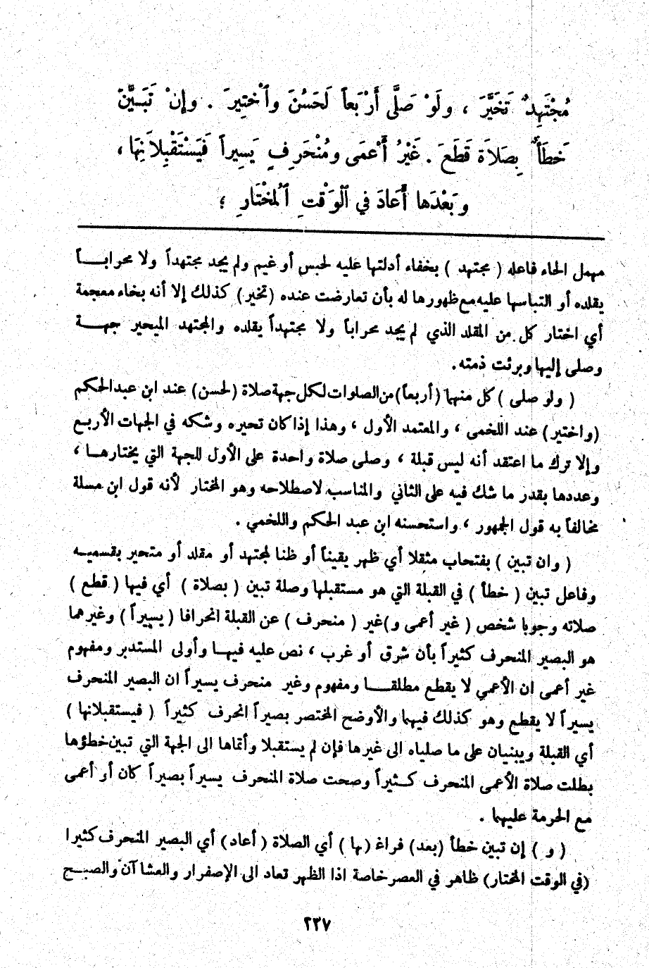 (وَإِنْ تَبَيَّنَ) بِفَتَحَاتٍ مُثَقَّلًا أَيْ ظَهَرَ يَقِينًا أَوْ ظَنًّا لِمُجْتَهِدٍ أَوْ مُقَلِّدٍ أَوْ مُتَحَيِّرٍ بِقِسْمَيْهِ وَفَاعِلُ تَبَيَّنَ (خَطَأٌ) فِي الْقِبْلَةِ الَّتِي هُوَ مُسْتَقْبِلُهَا وَصِلَةُ تَبَيَّنَ (بِصَلَاةٍ) أَيْ فِيهَا (قَطَعَ) صَلَاتَهُ وُجُوبًا شَخْصٌ (غَيْرُ أَعْمَى وَ) غَيْرُ (مُنْحَرِفٍ) عَنْ الْقِبْلَةِ انْحِرَافًا (يَسِيرًا) وَغَيْرُهُمَا هُوَ الْبَصِيرُ الْمُنْحَرِفُ كَثِيرًا بِأَنْ شَرَّقَ أَوْ غَرَّبَ، نَصَّ عَلَيْهِ فِيهَا وَأَوْلَى الْمُسْتَدْبِرُ وَمَفْهُومُ غَيْرُ أَعْمَى أَنَّ الْأَعْمَى لَا يَقْطَعُ مُطْلَقًا وَمَفْهُومُ وَغَيْرُ مُنْحَرِفٍ يَسِيرًا أَنَّ الْبَصِيرَ الْمُنْحَرِفَ يَسِيرًا لَا يَقْطَعُ وَهُوَ كَذَلِكَ فِيهِمَا وَالْأَوْضَحُ الْمُخْتَصَرُ بَصِيرًا انْحَرَفَ كَثِيرًا (فَيَسْتَقْبِلَانِهِ ا) أَيْ الْقِبْلَةَ وَيَبْنِيَانِ عَلَى مَا صَلَّيَاهُ إلَى غَيْرِهَا فَإِنْ لَمْ يَسْتَقْبِلَا وَأَتَمَّاهَا إلَى الْجِهَةِ الَّتِي تَبَيَّنَ خَطَؤُهَا بَطَلَتْ صَلَاةُ الْأَعْمَى الْمُنْحَرِفِ كَثِيرًا وَصَحَّتْ صَلَاةُ الْمُنْحَرِفِ يَسِيرًا بَصِيرًا كَانَ أَوْ أَعْمَى مَعَ الْحُرْمَةِ عَلَيْهِمَا.