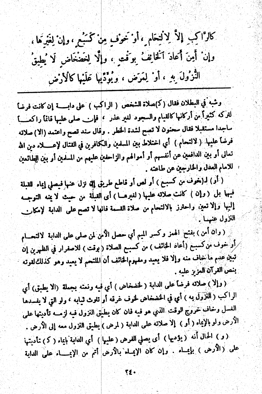 ـــــــــــــــــــــــــــــQوَشَبَّهَ فِي الْبُطْلَانِ فَقَالَ (كَ) صَلَاةِ الشَّيْخِ (الرَّاكِبِ) عَلَى دَابَّةٍ إنْ كَانَتْ فَرْضًا لِتَرْكِهِ كَثِيرًا مِنْ أَرْكَانِهَا كَالْقِيَامِ وَالسُّجُودِ لِغَيْرِ عُذْرٍ، فَإِنْ صَلَّى عَلَيْهَا قَائِمًا رَاكِعًا سَاجِدًا مُسْتَقْبِلًا فَقَالَ سَحْنُونٌ لَا تَصِحُّ لِشِدَّةِ الْخَطَرِ. وَقَالَ سَنَدٌ تَصِحُّ وَاعْتُمِدَ (إلَّا) صَلَاتُهُ فَرْضًا عَلَيْهَا (لِالْتِحَامٍ) أَيْ اخْتِلَاطٍ بَيْنَ الْمُسْلِمِينَ وَالْكَافِرِينَ فِي الْقِتَالِ لِإِعْلَاءِ دِينِ اللَّهِ تَعَالَى أَوْ بَيْنَ الدَّافِعِينَ عَنْ أَنْفُسِهِمْ أَوْ أَمْوَالِهِمْ وَالزَّاحِفِينَ عَلَيْهِمْ مِنْ الْمُسْلِمِينَ أَوْ بَيْنَ الطَّائِعِينَ لِلْإِمَامِ الْعَدْلِ وَالْخَارِجِينَ عَنْ طَاعَتِهِ.