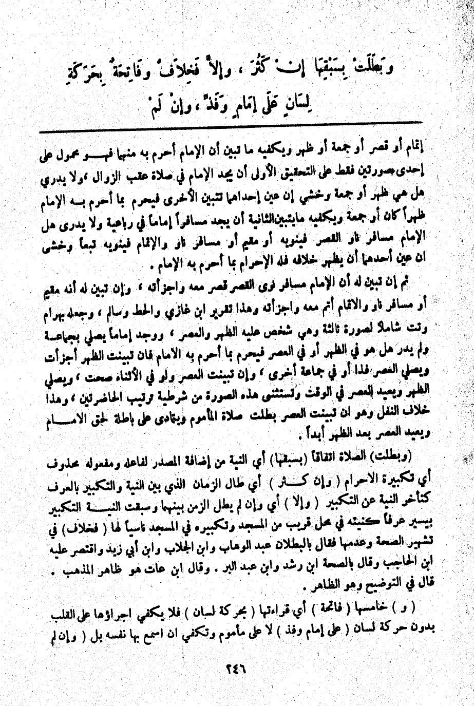 ثُمَّ إنْ تَبَيَّنَ لَهُ أَنَّ الْإِمَامَ مُسَافِرٌ نَوَى الْقَصْرَ قَصَرَ مَعَهُ وَأَجْزَأْته، وَإِنْ تَبَيَّنَ لَهُ أَنَّهُ مُقِيمٌ أَوْ مُسَافِرٌ نَاوٍ الْإِتْمَامَ أَتَمَّ مَعَهُ وَأَجْزَأَتْهُ وَهَذَا تَقْرِيرُ ابْنِ غَازِيٍّ وَالْحَطّ وَسَالِمٍ، وَجَعَلَهُ بَهْرَامُ وتت شَامِلًا لِصُورَةٍ ثَالِثَةٍ وَهِيَ شَخْصٌ عَلَيْهِ الظُّهْرُ وَالْعَصْرُ، وَوَجَدَ إمَامًا يُصَلِّي بِجَمَاعَةٍ وَلَمْ يَدْرِ هَلْ هُوَ فِي الظُّهْرِ أَوْ فِي الْعَصْرِ فَيُحْرِمُ بِمَا أَحْرَمَ بِهِ الْإِمَامُ فَإِنْ تَبَيَّنَتْ الظُّهْرُ أَجْزَأَتْ وَيُصَلِّي الْعَصْرَ فَذًّا أَوْ فِي جَمَاعَةٍ أُخْرَى، وَإِنْ تَبَيَّنَتْ الْعَصْرُ وَلَوْ فِي الْأَثْنَاءِ صَحَّتْ، وَيُصَلِّي الظُّهْرَ وَيُعِيدُ الْعَصْرَ فِي الْوَقْتِ وَتُسْتَثْنَى، هَذِهِ الصُّورَةُ مِنْ شَرْطِيَّةِ تَرْتِيبِ الْحَاضِرَتَيْنِ، وَهَذَا خِلَافُ النَّفْلِ وَهُوَ إنْ تَبَيَّنَتْ الْعَصْرَ بَطَلَتْ صَلَاةُ الْمَأْمُومِ وَيَتَمَادَى عَلَى بَاطِلَةٍ لِحَقِّ الْإِمَامِ وَيُعِيدُ الْعَصْرَ بَعْدَ الظُّهْرِ أَبَدًا.