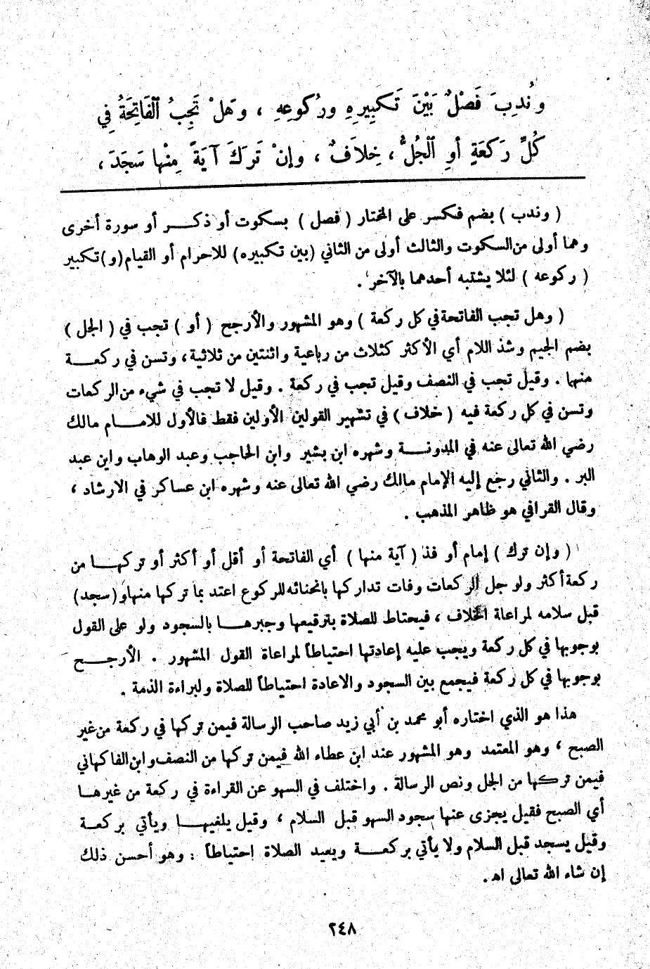 (وَهَلْ تَجِبُ الْفَاتِحَةُ فِي كُلِّ رَكْعَةٍ) وَهُوَ الْمَشْهُورُ وَالْأَرْجَحُ (أَوْ) تَجِبُ فِي (الْجُلِّ) بِضَمِّ الْجِيمِ وَشَدِّ اللَّامِ أَيْ الْأَكْثَرِ كَثَلَاثٍ مِنْ رُبَاعِيَّةٍ وَاثْنَتَيْنِ مِنْ ثُلَاثِيَّةٍ، وَتُسَنُّ فِي رَكْعَةٍ مِنْهُمَا. وَقِيلَ تَجِبُ فِي النِّصْفِ وَقِيلَ تَجِبُ فِي رَكْعَةٍ. وَقِيلَ لَا تَجِبُ فِي شَيْءٍ مِنْ الرَّكَعَاتِ وَتُسَنُّ فِي كُلِّ رَكْعَةٍ فِيهِ (خِلَافٌ) فِي تَشْهِيرِ الْقَوْلَيْنِ الْأَوَّلَيْنِ فَالْأَوَّلُ لِلْإِمَامِ مَالِكٍ - رَضِيَ اللَّهُ عَنْهُ - فِي الْمُدَوَّنَةِ وَشَهَرَهُ ابْنُ بَشِيرٍ وَابْنُ الْحَاجِبِ وَعَبْدُ الْوَهَّابِ وَابْنُ عَبْدِ الْبَرِّ. وَالثَّانِي رَجَعَ إلَيْهِ الْإِمَامُ مَالِكٌ - رَضِيَ اللَّهُ عَنْهُ - وَشَهَرَهُ ابْنُ عَسَاكِرَ فِي الْإِرْشَادِ، وَقَالَ الْقَرَافِيُّ هُوَ ظَاهِرُ الْمَذْهَبِ.