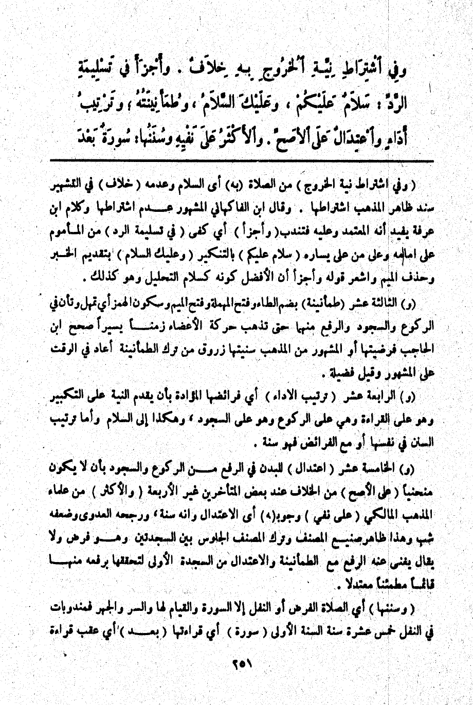 ـــــــــــــــــــــــــــــQ (وَفِي اشْتِرَاطِ نِيَّةِ الْخُرُوجِ) مِنْ الصَّلَاةِ (بِهِ) أَيْ السَّلَامِ وَعَدَمِهِ (خِلَافٌ) فِي التَّشْهِيرِ سَنَدٌ ظَاهِرُ الْمَذْهَبِ اشْتِرَاطُهَا. وَقَالَ ابْنُ الْفَاكِهَانِيِّ الْمَشْهُورُ عَدَمُ اشْتِرَاطِهَا وَكَلَامُ ابْنِ عَرَفَةَ يُفِيدُ أَنَّهُ الْمُعْتَمَدُ وَعَلَيْهِ فَتُنْدَبُ (وَأَجْزَأَ) أَيْ كَفَى (فِي تَسْلِيمَةِ الرَّدِّ) مِنْ الْمَأْمُومِ عَلَى إمَامِهِ وَعَلَى مَنْ عَلَى يَسَارِهِ (سَلَامٌ عَلَيْكُمْ) بِالتَّنْكِيرِ (وَعَلَيْك السَّلَامُ) بِتَقْدِيمِ الْخَبَرِ وَحَذْفِ الْمِيمِ وَأَشْعَرَ قَوْلُهُ وَأَجْزَأَ أَنَّ الْأَفْضَلَ كَوْنُهُ كَسَلَامِ التَّحْلِيلِ وَهُوَ كَذَلِكَ.