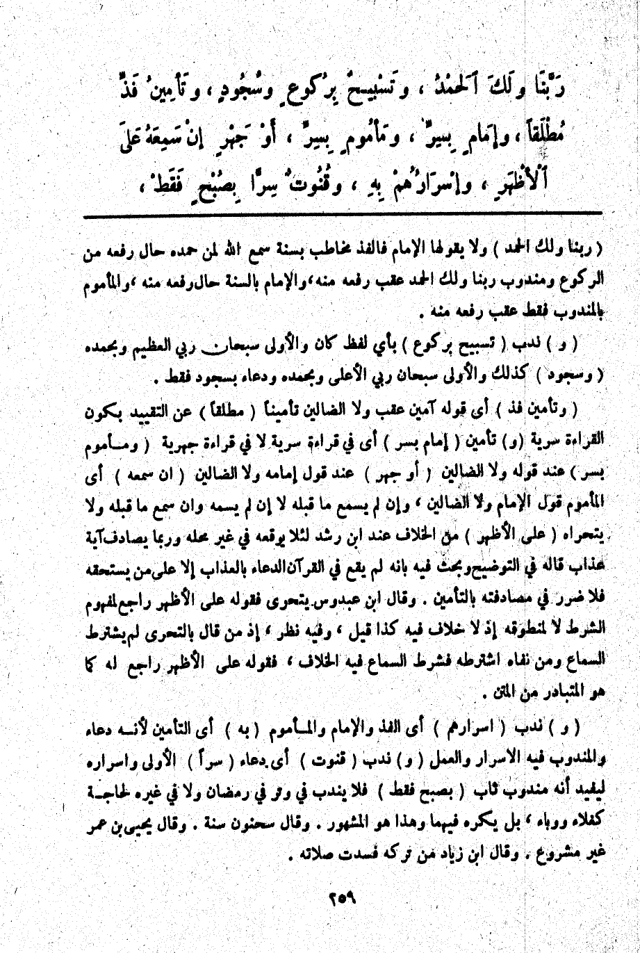 رَبَّنَا وَلَك الْحَمْدُ، وَتَسْبِيحٌ بِرُكُوعٍ وَسُجُودٍ، وَتَأْمِينُ فَذٍّ مُطْلَقًا، وَإِمَامٍ بِسِرٍّ، وَمَأْمُومٍ بِسِرٍّ، أَوْ جَهْرٍ إنْ سَمِعَهُ عَلَى الْأَظْهَرِ، وَإِسْرَارُهُمْ بِهِ