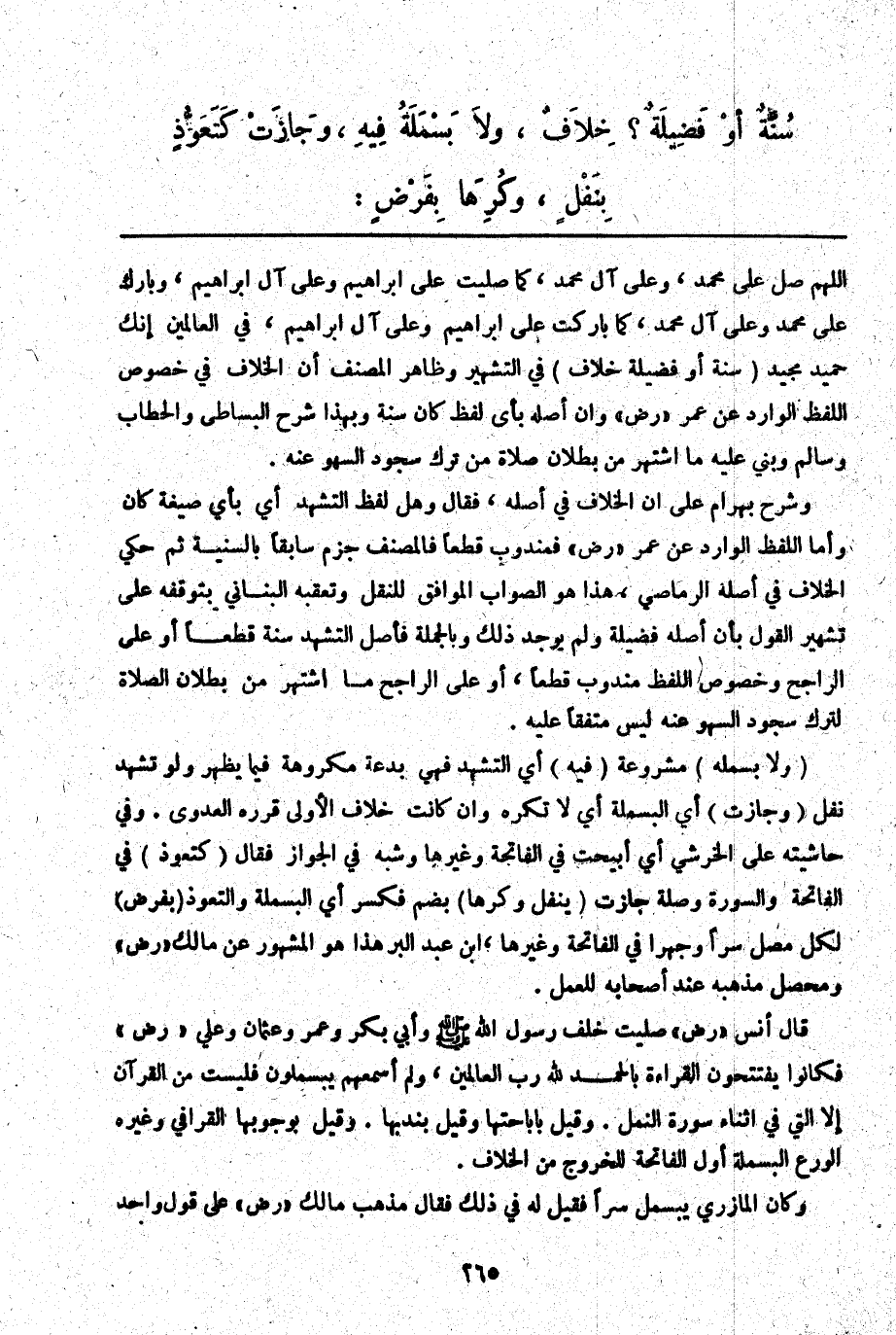 ـــــــــــــــــــــــــــــQاللَّهُمَّ صَلِّ عَلَى مُحَمَّدٍ، وَعَلَى آلِ مُحَمَّدٍ، كَمَا صَلَّيْت عَلَى إبْرَاهِيمَ وَعَلَى آلِ إبْرَاهِيمَ، وَبَارِكْ عَلَى مُحَمَّدٍ وَعَلَى آلِ مُحَمَّدٍ، كَمَا بَارَكْت عَلَى إبْرَاهِيمَ وَعَلَى آلِ إبْرَاهِيمَ، فِي الْعَالَمِينَ إنَّك حَمِيدٌ مَجِيدٌ (سُنَّةٌ أَوْ فَضِيلَة خِلَافٌ) فِي التَّشْهِيرِ وَظَاهِرُ الْمُصَنِّفِ أَنَّ الْخِلَافَ فِي خُصُوصِ اللَّفْظِ الْوَارِدِ عَنْ عُمَرَ " رَضٍ " وَإِنَّ أَصْلَهُ بِأَيِّ لَفْظٍ كَانَ سُنَّةً وَبِهَذَا شَرَحَ الْبِسَاطِيُّ وَالْحَطَّابِ وَسَالِمٍ وَبُنِيَ عَلَيْهِ مَا اشْتَهَرَ مِنْ بُطْلَانِ صَلَاةِ مَنْ تَرَكَ سُجُودَ السَّهْوِ عَنْهُ.