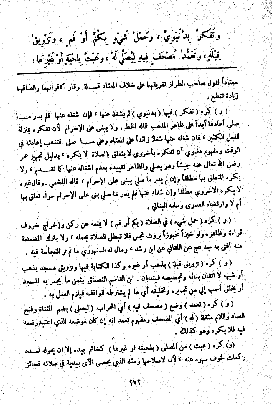 وَتَفَكُّرٌ بِدُنْيَوِيٍّ، وَحَمْلُ شَيْءٍ بِكُمٍّ أَوْ فَمٍ، وَتَزْوِيقُ قِبْلَةٍ، وَتَعَمُّدُ مُصْحَفٍ فِيهِ لِيُصَلِّيَ لَهُ