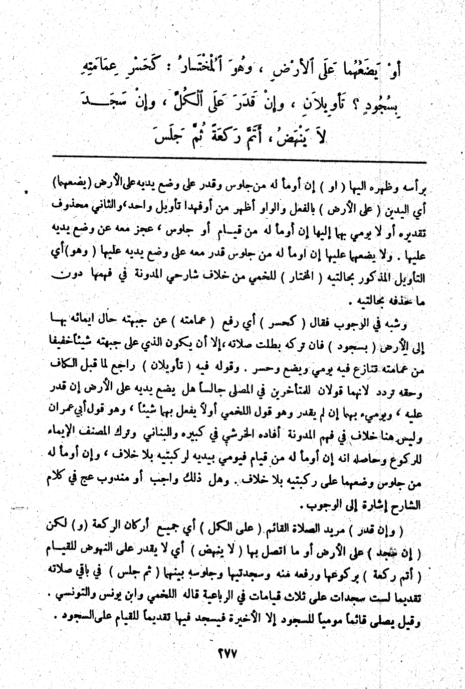 ـــــــــــــــــــــــــــــQبِرَأْسِهِ وَظَهْرُهُ إلَيْهَا (أَوْ) إنْ أَوْمَأَ لَهُ مِنْ جُلُوسٍ وَقَدَرَ عَلَى وَضْعِ يَدَيْهِ عَلَى الْأَرْضِ (يَضَعُهُمَا) أَيْ الْيَدَيْنِ (عَلَى الْأَرْضِ) بِالْفِعْلِ وَالْوَاوِ أَظْهَرُ مِنْ أَوْ فَهَذَا تَأْوِيلٌ وَاحِدٌ، وَالثَّانِي مَحْذُوفٌ تَقْدِيرُهُ أَوْ لَا يُومِئُ بِهِمَا إلَيْهَا إنْ أَوْمَأَ لَهُ مِنْ قِيَامٍ أَوْ جُلُوسٍ، عَجَزَ مَعَهُ عَنْ وَضْعِ يَدَيْهِ عَلَيْهَا. وَلَا يَضَعُهُمَا عَلَيْهَا إنْ أَوْمَأَ لَهُ مِنْ جُلُوسٍ قَدَرَ مَعَهُ عَلَى وَضْعِ يَدَيْهِ عَلَيْهَا (وَهُوَ) أَيْ التَّأْوِيلُ الْمَذْكُورُ بِحَالَتَيْهِ (الْمُخْتَارُ) لِلَّخْمِيِّ مِنْ خِلَافِ شَارِحِي الْمُدَوَّنَةِ فِي فَهْمِهَا دُونَ مَا حَذَفَهُ بِحَالَتَيْهِ.