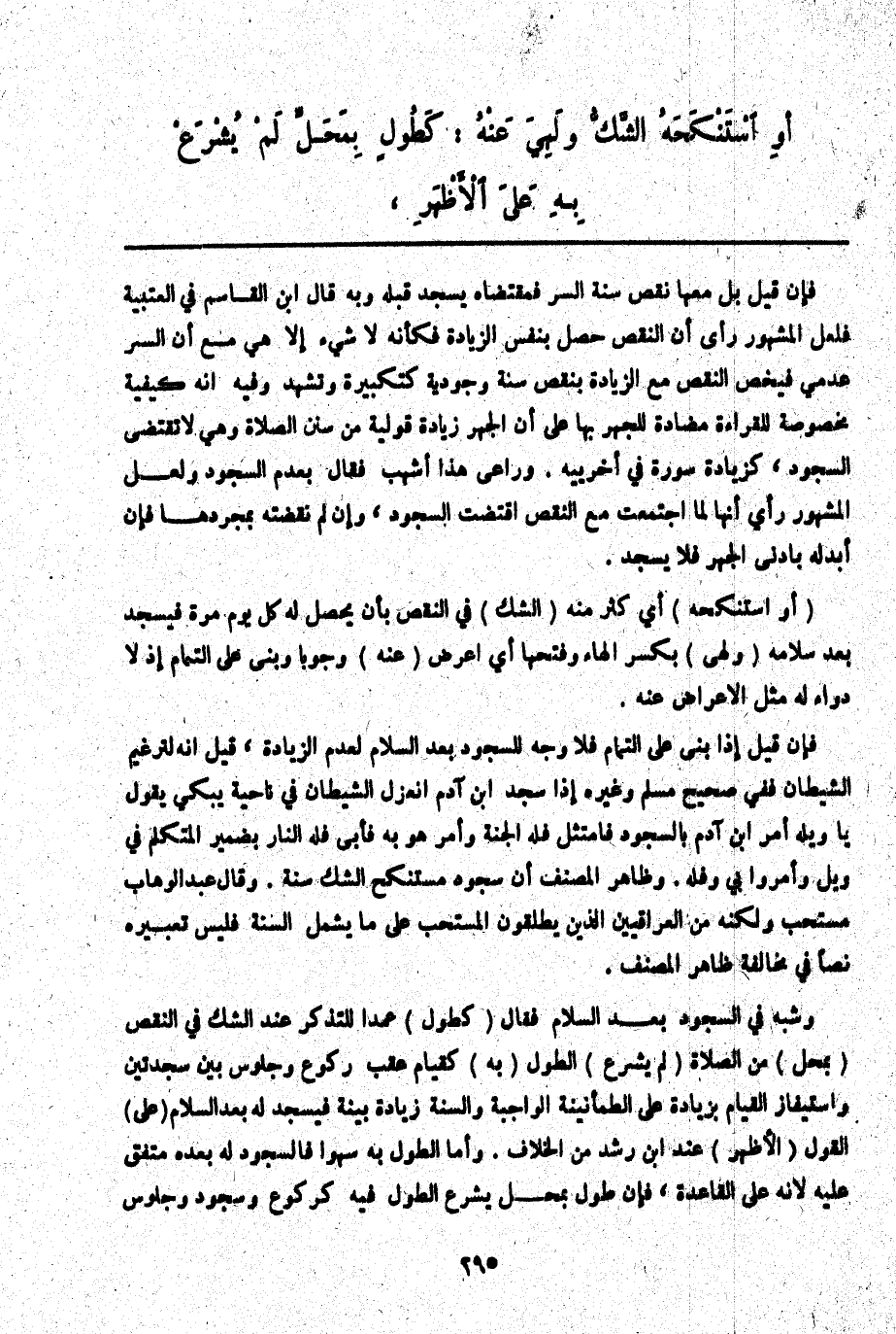 وَشَبَّهَ فِي السُّجُودِ بَعْدَ السَّلَامِ فَقَالَ (كَطُولٍ) عَمْدًا لِلتَّذَكُّرِ عِنْدَ الشَّكِّ فِي النَّقْصِ (بِمَحَلٍّ) مِنْ الصَّلَاةِ (لَمْ يُشْرَعْ) الطُّولُ (بِهِ) كَقِيَامٍ عَقِبَ رُكُوعٍ وَجُلُوسٍ بَيْنَ سَجْدَتَيْنِ وَاسْتِيفَازِ الْقِيَامِ بِزِيَادَةٍ عَلَى الطُّمَأْنِينَةِ الْوَاجِبَةِ وَالسُّنَّةُ زِيَادَةُ بَيِّنَةٍ فَيَسْجُدُ لَهُ بَعْدَ السَّلَامِ (عَلَى) الْقَوْلِ (الْأَظْهَرِ) عِنْدَ ابْنِ رُشْدٍ مِنْ الْخِلَافِ. وَأَمَّا الطُّولُ بِهِ سَهْوًا فَالسُّجُودُ لَهُ بَعْدَهُ مُتَّفَقٌ عَلَيْهِ لِأَنَّهُ عَلَى الْقَاعِدَةِ، فَإِنْ طَوَّلَ بِمَحَلٍّ يُشْرَعُ الطُّولُ فِيهِ كَرُكُوعٍ وَسُجُودٍ وَجُلُوسٍ
