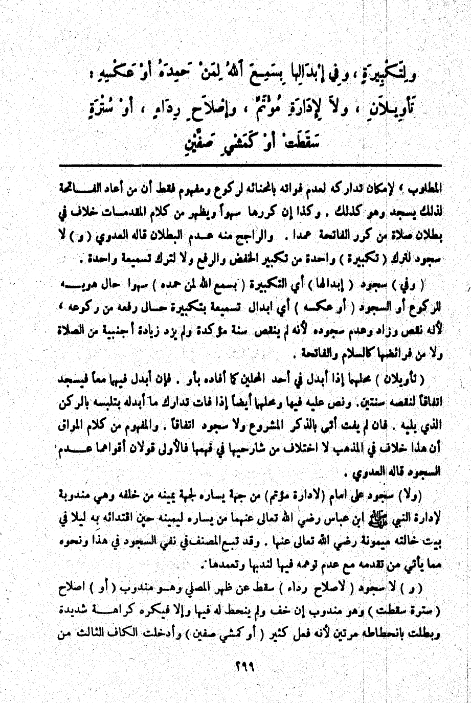ـــــــــــــــــــــــــــــQالْمَطْلُوبُ، لِإِمْكَانِ تَدَارُكِهِ لِعَدَمِ فَوَاتِهِ بِانْحِنَائِهِ لِرُكُوعٍ وَمَفْهُومُ فَقَطْ أَنَّ مَنْ أَعَادَ الْفَاتِحَةَ لِذَلِكَ يَسْجُدُ وَهُوَ كَذَلِكَ. وَكَذَا إنْ كَرَّرَهَا سَهْوًا وَيَظْهَرُ مِنْ كَلَامِ الْمُقَدِّمَاتِ خِلَافٌ فِي بُطْلَانِ صَلَاةِ مَنْ كَرَّرَ الْفَاتِحَةَ عَمْدًا. وَالرَّاجِحُ مِنْهُ عَدَمُ الْبُطْلَانِ قَالَهُ الْعَدَوِيُّ (وَ) لَا سُجُودَ لِتَرْكِ (تَكْبِيرَةٍ) وَاحِدَةٍ مِنْ تَكْبِيرِ الْخَفْضِ وَالرَّفْعِ وَلَا لِتَرْكِ تَسْمِيعَةٍ وَاحِدَةٍ.