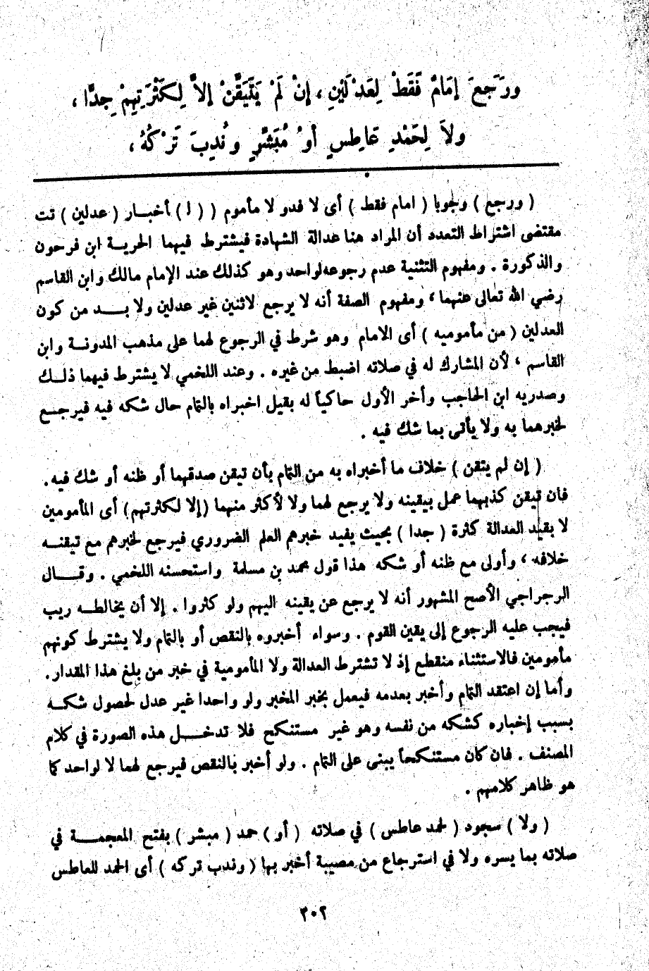 ـــــــــــــــــــــــــــــQ (وَرَجَعَ) وُجُوبًا (إمَامٌ فَقَطْ) أَيْ لَا فَذٌّ وَلَا مَأْمُومٌ (لِ) إخْبَارِ (عَدْلَيْنِ) تت مُقْتَضَى اشْتِرَاطِ التَّعَدُّدِ أَنَّ الْمُرَادَ هُنَا عَدَالَةُ الشَّهَادَةِ فَيُشْتَرَطُ فِيهِمَا الْحُرِّيَّةُ ابْنُ فَرْحُونٍ وَالذُّكُورَةُ. وَمَفْهُومُ التَّثْنِيَةِ عَدَمُ رُجُوعِهِ لِوَاحِدٍ وَهُوَ كَذَلِكَ عِنْدَ الْإِمَامِ مَالِكٍ وَابْنِ الْقَاسِمِ - رَضِيَ اللَّهُ تَعَالَى عَنْهُمَا -، وَمَفْهُومُ التَّثْنِيَةِ أَنَّهُ لَا يَرْجِعُ لِاثْنَيْنِ غَيْرِ عَدْلَيْنِ وَلَا بُدَّ مِنْ كَوْنِ الْعَدْلَيْنِ (مِنْ مَأْمُومِيهِ) أَيْ الْإِمَامِ وَهُوَ شَرْطٌ فِي الرُّجُوعِ لَهُمَا عَلَى مَذْهَبِ الْمُدَوَّنَةِ وَابْنِ الْقَاسِمِ لِأَنَّ الْمُشَارِكَ لَهُ فِي صَلَاتِهِ أَضْبَطُ مِنْ غَيْرِهِ. وَعِنْدَ اللَّخْمِيِّ لَا يُشْتَرَطُ فِيهِمَا ذَلِكَ وَصَدْرَيْهِ ابْنُ الْحَاجِبِ وَأَخَّرَ الْأَوَّلَ حَاكِيًا لَهُ بِقِيلِ أَخْبَرَاهُ بِالتَّمَامِ حَالَ شَكِّهِ فِيهِ فَيَرْجِعُ لِخَبَرِهِمَا بِهِ وَلَا يَأْتِي بِمَا شَكَّ فِيهِ.