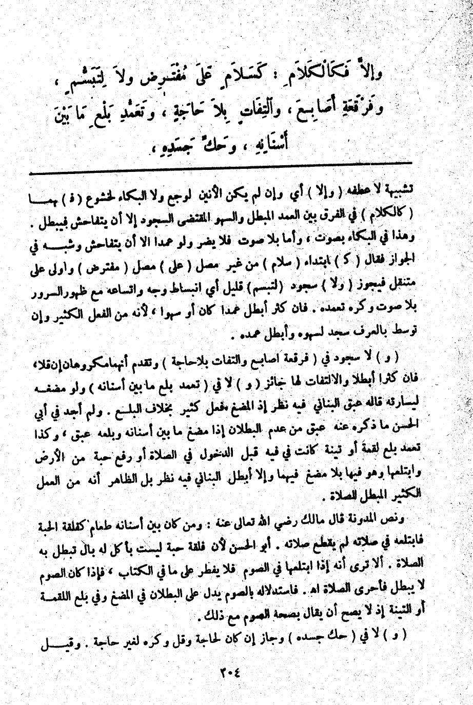 ـــــــــــــــــــــــــــــQتَشْبِيهُهُ لَا عَطْفُهُ (وَإِلَّا) أَيْ وَإِنْ لَمْ يَكُنْ الْأَنِينُ لِوَجَعٍ وَلَا الْبُكَاءُ لِخُشُوعٍ (فَ) هُمَا (كَالْكَلَامِ) فِي الْفَرْقِ بَيْنَ الْعَمْدِ الْمُبْطِلِ وَالسَّهْوِ الْمُقْتَضِي السُّجُودَ إلَّا أَنْ يَتَفَاحَشَ فَيَبْطُلَ. وَهَذَا فِي الْبُكَاءِ بِصَوْتٍ وَأَمَّا بِلَا صَوْتٍ فَلَا يَضُرُّ وَلَوْ عَمْدًا إلَّا أَنْ يَتَفَاحَشَ وَشَبَّهَ فِي الْجَوَازِ فَقَالَ (كَ) ابْتِدَاءِ (سَلَامٍ) مِنْ غَيْرِ مُصَلٍّ (عَلَى) مُصَلٍّ (مُفْتَرِضٍ) وَأَوْلَى عَلَى مُنْتَقِلٍ فَيَجُوزُ (وَلَا) سُجُودَ (لِتَبَسُّمٍ) قَلِيلٍ أَيْ انْبِسَاطِ وَجْهٍ وَاتِّسَاعِهِ مَعَ ظُهُورِ السُّرُورِ بِلَا صَوْتٍ وَكُرِهَ تَعَمُّدُهُ. فَإِنْ كَثُرَ أَبْطَلَ عَمْدًا كَانَ أَوْ سَهْوًا لِأَنَّهُ مِنْ الْفِعْلِ الْكَثِيرِ وَإِنْ تَوَسَّطَ بِالْعُرْفِ سَجَدَ لِسَهْوِهِ وَأَبْطَلَ عَمْدُهُ.