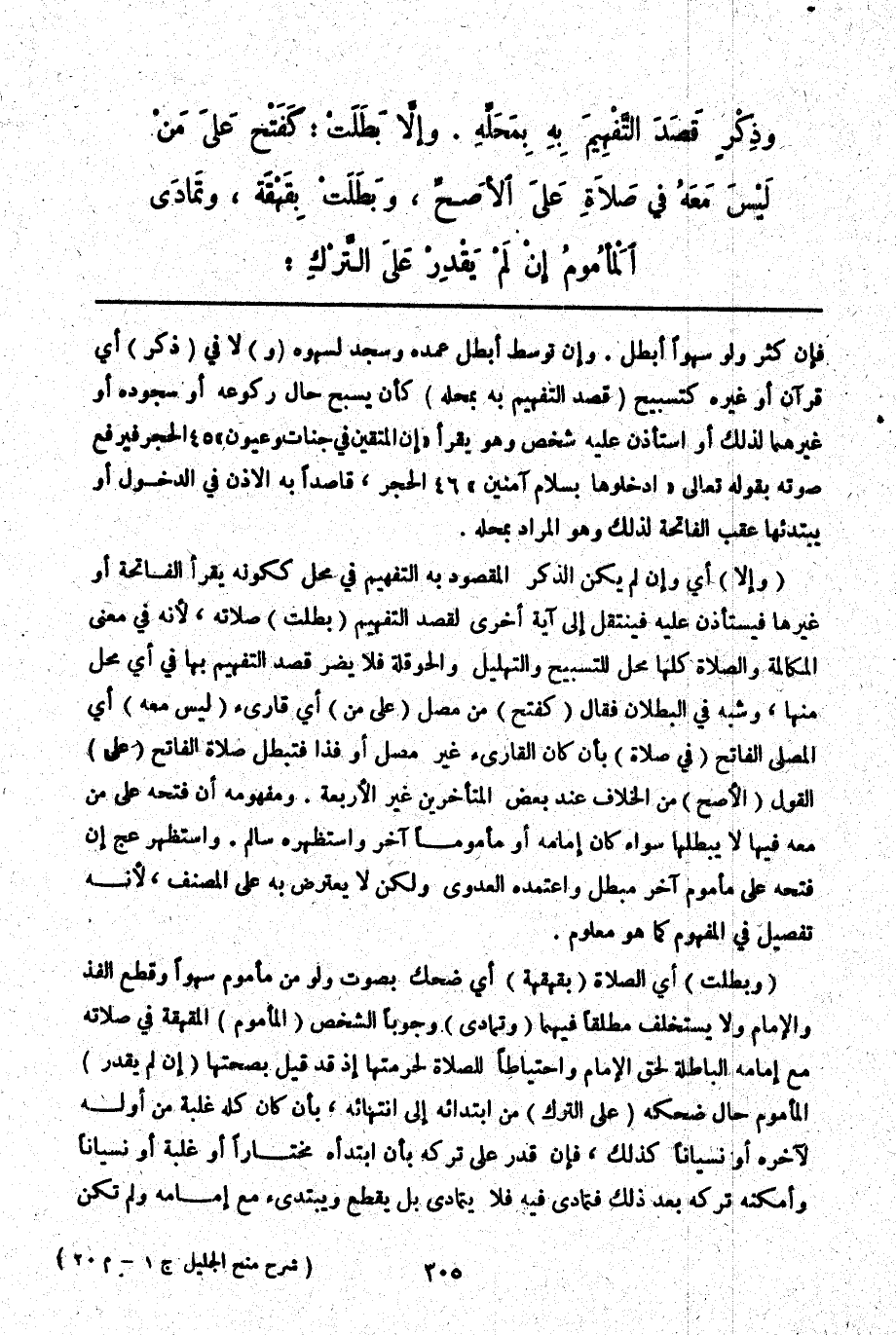 (وَبَطَلَتْ) أَيْ الصَّلَاةُ (بِقَهْقَهَةٍ) أَيْ ضَحِكٍ بِصَوْتٍ وَلَوْ مِنْ مَأْمُومٍ سَهْوًا وَقَطَعَ الْفَذُّ وَالْإِمَامُ وَلَا يَسْتَخْلِفُ مُطْلَقًا فِيهِمَا (وَتَمَادَى) وُجُوبًا الشَّخْصُ (الْمَأْمُومُ) الْمُقَهْقِهُ فِي صَلَاتِهِ مَعَ إمَامِهِ الْبَاطِلَةَ لِحَقِّ الْإِمَامِ وَاحْتِيَاطًا لِلصَّلَاةِ لِحُرْمَتِهَا إذْ قَدْ قِيلَ بِصِحَّتِهَا (إنْ لَمْ يَقْدِرْ) الْمَأْمُومُ حَالَ ضَحِكِهِ (عَلَى التَّرْكِ) مِنْ ابْتِدَائِهِ إلَى انْتِهَائِهِ، بِأَنْ كَانَ كُلُّهُ غَلَبَةً مِنْ أَوَّلِهِ لِآخِرِهِ أَوْ نِسْيَانًا كَذَلِكَ، فَإِنْ قَدَرَ عَلَى تَرْكِهِ بِأَنْ ابْتَدَأَهُ مُخْتَارًا أَوْ غَلَبَةً أَوْ نِسْيَانًا وَأَمْكَنَهُ تَرْكُهُ بَعْدَ ذَلِكَ فَتَمَادَى فِيهِ فَلَا يَتَمَادَى بَلْ يَقْطَعُ وَيَبْتَدِئُ مَعَ إمَامِهِ وَلَمْ تَكُنْ
