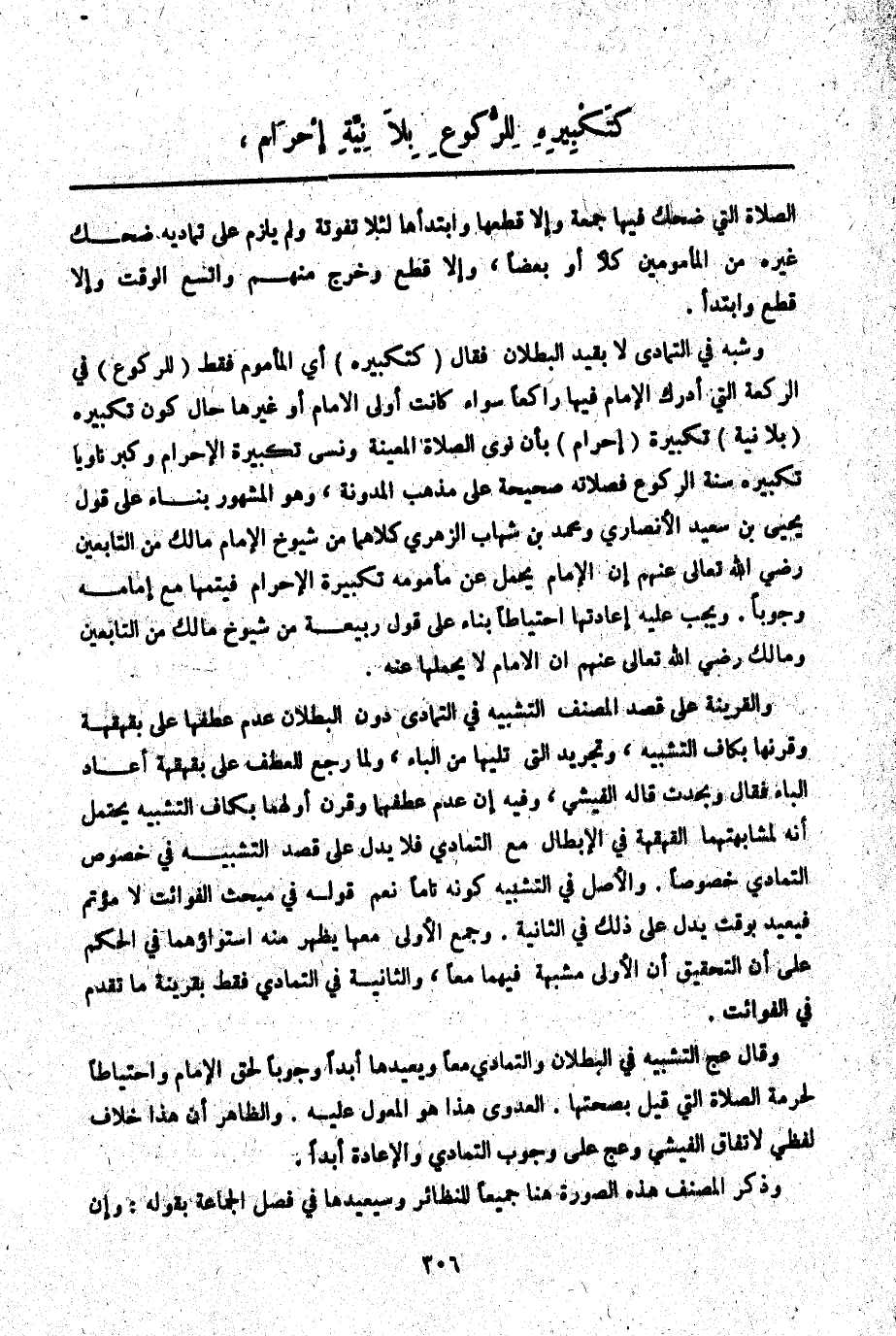 وَشَبَّهَ فِي التَّمَادِي لَا بِقَيْدِ الْبُطْلَانِ فَقَالَ (كَتَكْبِيرِهِ) أَيْ الْمَأْمُومِ فَقَطْ (لِلرُّكُوعِ) فِي الرَّكْعَةِ الَّتِي أَدْرَكَ الْإِمَامَ فِيهَا رَاكِعًا سَوَاءٌ كَانَتْ أُولَى الْإِمَامِ أَوْ غَيْرَهَا حَالَ كَوْنِ تَكْبِيرِهِ (بِلَا نِيَّةِ) تَكْبِيرَةِ (إحْرَامٍ) بِأَنْ نَوَى الصَّلَاةَ الْمُعَيَّنَةَ وَنَسِيَ تَكْبِيرَةَ الْإِحْرَامِ وَكَبَّرَ نَاوِيًا تَكْبِيرَةَ سُنَّةِ الرُّكُوعِ فَصَلَاتُهُ صَحِيحَةٌ عَلَى مَذْهَبِ الْمُدَوَّنَةِ، وَهُوَ الْمَشْهُورُ بِنَاءً عَلَى قَوْلِ يَحْيَى بْنِ سَعِيدٍ الْأَنْصَارِيِّ وَمُحَمَّدِ بْنِ شِهَابٍ الزُّهْرِيِّ كِلَاهُمَا مِنْ شُيُوخِ الْإِمَامِ مَالِكٍ مِنْ التَّابِعِينَ - رَضِيَ اللَّهُ تَعَالَى عَنْهُمْ - أَنَّ الْإِمَامَ يَحْمِلُ عَنْ مَأْمُومِهِ تَكْبِيرَةَ الْإِحْرَامِ فَيُتِمُّهَا مَعَ إمَامِهِ وُجُوبًا. وَيَجِبُ عَلَيْهِ إعَادَتُهَا احْتِيَاطًا بِنَاءً عَلَى قَوْلِ رَبِيعَةَ مِنْ شُيُوخِ مَالِكٍ مِنْ التَّابِعِينَ وَمَالِكٍ - رَضِيَ اللَّهُ تَعَالَى عَنْهُمْ - أَنَّ الْإِمَامَ لَا يَحْمِلُهَا عَنْهُ.