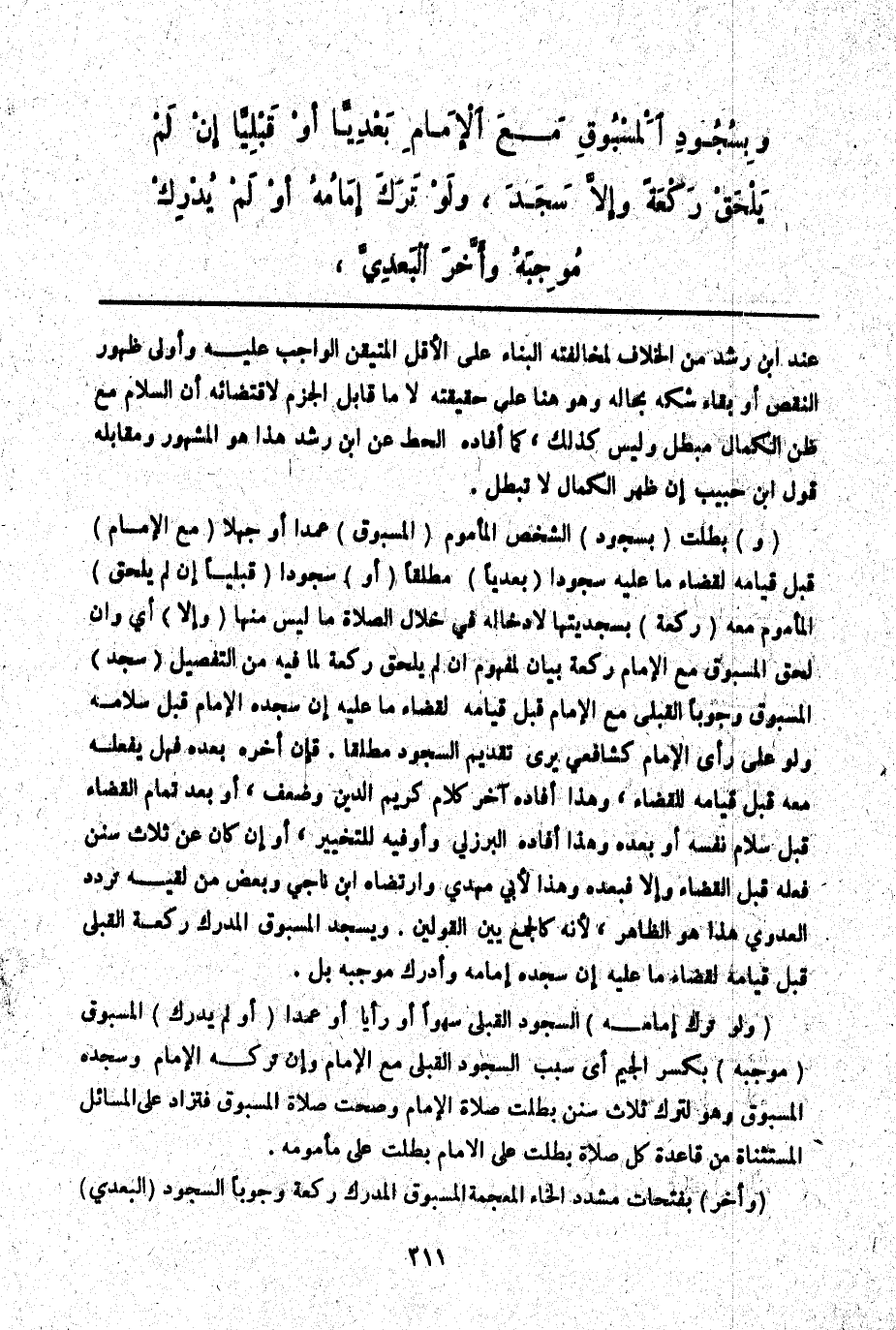 (وَ) بَطَلَتْ (بِسُجُودِ) الشَّخْصِ الْمَأْمُومِ (الْمَسْبُوقِ) عَمْدًا أَوْ جَهْلًا (مَعَ الْإِمَامِ) قَبْلَ قِيَامِهِ لِقَضَاءِ مَا عَلَيْهِ سُجُودًا (بَعْدِيًّا) مُطْلَقًا (أَوْ) سُجُودًا (قَبْلِيًّا إنْ لَمْ يَلْحَقْ) الْمَأْمُومُ مَعَهُ (رَكْعَةً) بِسَجْدَتَيْهَا لِإِدْخَالِهِ فِي خِلَالِ الصَّلَاةِ مَا لَيْسَ مِنْهَا (وَإِلَّا) أَيْ وَإِنْ لَحِقَ الْمَسْبُوقُ مَعَ الْإِمَامِ رَكْعَةً بَيَانٌ لِمَفْهُومِ إنْ لَمْ يَلْحَقْ رَكْعَةً لِمَا فِيهِ مِنْ التَّفْصِيلِ (سَجَدَ) الْمَسْبُوقُ وُجُوبًا الْقَبْلِيَّ مَعَ الْإِمَامِ قَبْلَ قِيَامِهِ لِقَضَاءِ مَا عَلَيْهِ إنْ سَجَدَهُ الْإِمَامُ قَبْلَ سَلَامِهِ وَلَوْ عَلَى رَأْيِ الْإِمَامِ كَشَافِعِيٍّ يَرَى تَقْدِيمَ السُّجُودِ مُطْلَقًا. فَإِنْ أَخَّرَهُ بَعْدَهُ فَهَلْ يَفْعَلُهُ مَعَهُ قَبْلَ قِيَامِهِ لِلْقَضَاءِ، وَهَذَا أَفَادَهُ آخِرَ كَلَامِ كَرِيمِ الدِّينِ وَضُعِّفَ، أَوْ بَعْدَ تَمَامِ الْقَضَاءِ قَبْلَ سَلَامِ نَفْسِهِ أَوْ بَعْدَهُ وَهَذَا أَفَادَهُ الْبُرْزُلِيُّ وَأَوْ فِيهِ لِلتَّخْيِيرِ، أَوْ إنْ كَانَ عَنْ ثَلَاثِ سُنَنٍ فَعَلَهُ قَبْلَ الْقَضَاءِ وَإِلَّا فَبَعْدَهُ وَهَذَا لِأَبِي مَهْدِيٍّ وَارْتَضَاهُ ابْنُ نَاجِي وَبَعْضُ مَنْ لَقِيَهُ تَرَدَّدَ الْعَدَوِيُّ هَذَا هُوَ الظَّاهِرُ لِأَنَّهُ كَالْجَمْعِ بَيْنَ الْقَوْلَيْنِ. وَيَسْجُدُ الْمَسْبُوقُ الْمُدْرِكُ رَكْعَةَ الْقَبْلِيِّ قَبْلَ قِيَامِهِ لِقَضَاءِ مَا عَلَيْهِ إنْ سَجَدَهُ إمَامُهُ وَأَدْرَكَ مُوجِبَهُ بَلْ.